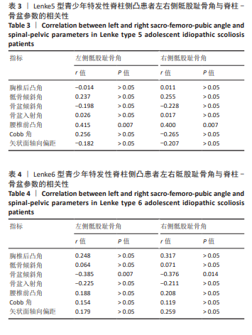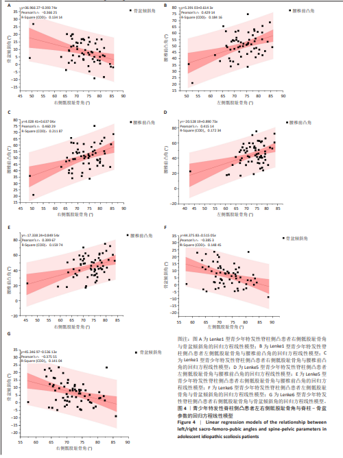 RESULTS AND CONCLUSION: (1) In Lenke type 1 adolescent idiopathic scoliosis patients, right sacro-femoro-pubic angle showed a significant negative correlation with pelvic tilt (r=-0.366, P=0.028) and a significant positive correlation with lumbar lordosis (r=0.429, P=0.007; r=0.460, P=0.007). In Lenke type 5 adolescent idiopathic scoliosis patients, left/right sacro-femoro-pubic angle showed a significant positive correlation with lumbar lordosis (r=0.415, P=0.007; r=0.400, P=0.007). In Lenke type 6 adolescent idiopathic scoliosis patients, while left/right sacro-femoro-pubic angle showed a significant negative correlation with pelvic tilt (r=-0.385, P=0.007; r=-0.376, P=0.014). Univariate regression models quantified these associations (R²=0.13-0.21). Among them, the regression slope between sacro-femoro-pubic angle and lumbar lordosis was largest (0.85-0.89) in Lenke type 5 adolescent idiopathic scoliosis patients, while the regression slope between sacro-femoro-pubic angle and pelvic tilt ranged from -0.52 to -0.54 in Lenke type 6 adolescent idiopathic scoliosis patients. (2) The results indicate that the association between sacro-femoro-pubic angle and spine-pelvic parameters in Lenke types 1, 5, and 6 adolescent idiopathic scoliosis patients exhibits clear classification-specificity. Lenke types 1 and 5 are primarily characterized by a positive association between sacro-femoro-pubic angle and lumbar lordosis, while Lenke type 6 is characterized by a bilateral negative association between sacro-femoro-pubic angle and pelvic tilt.