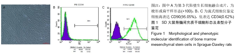 图1 SD大鼠骨髓间充质干细胞形态及表型分子鉴定