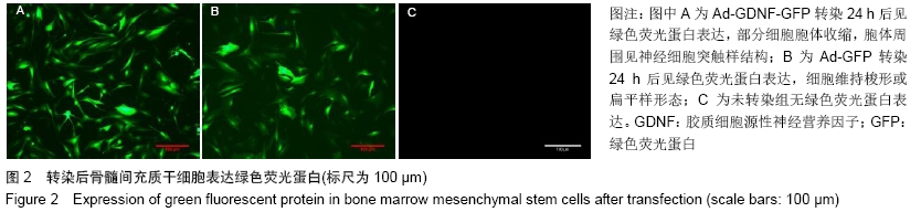 结果:各组细胞转染、体外培养72 h后荧光显微镜观察Ad-GDNF- GFP转染组可见GFP绿色荧光,该组部分细胞胞体收缩,胞体周围见神经细胞突触样结构,见图2A;Ad-GFP转染组中可见GFP绿色荧光,但BMSCs基本维持梭形或扁平样形态,见图2B;未转染组中未见绿色荧光表达,见图2C。