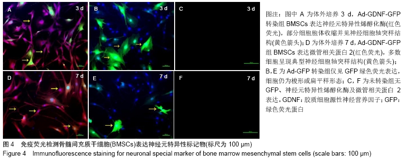 结果:免疫荧光检测结果表明Ad-GDNF-GFP转染组BMSCs体外培养3 d后可见神经元特异性烯醇化酶红色荧光表达,见图4A,细胞胞体收缩,胞体周围可见神经元轴突样结构,体外培养7 d后可见微管相关蛋白2红色荧光表达,细胞胞体周围可见神经细胞轴突样结构并相互连接成网,见图4D。Ad-GFP转染组BMSCs仅表达GFP绿色荧光,见图4B,E,细胞仍维持梭形或扁平样形态,未见红色荧光标记神经元特异性烯醇化酶及微管相关蛋白2表达,未转染对照组未见GFP表达,亦未见神经元特异性烯醇化酶及微管相关蛋白2表达,见图4C,F。