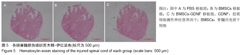 结果:苏木精-伊红染色结果显示,PBS移植组大鼠脊髓形态不完整,组织结构紊乱,细胞及血管周围间隙扩大,脊髓损伤区域大量炎性细胞浸润、脊髓空洞明显,见图5A。与PBS移植组对比,BMSCs移植组脊髓损伤区域空洞面积减小,但损伤区域仍有较明显的炎性细胞浸润,见图5B;BMSCs-GDNF移植组脊髓损伤空洞面积相对最小,脊髓形态组织结构相对完整,炎性细胞浸润明显减少,见图5C。