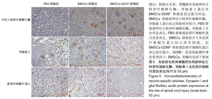 结果:免疫组化染色结果显示BMSCs-GDNF移植治疗后4周脊髓损伤局部可见较多神经元特异性烯醇化酶阳性细胞分布,BMSCs移植组脊髓损伤局部亦可见神经元特异性烯醇化酶阳性细胞散在分布,但阳性细胞数较少,而PBS移植对照组未见明显阳性细胞。BMSCs-GDNF移植组与BMSCs移植组脊髓损伤局部可见棕褐色突触素Ⅰ蛋白表达,PBS移植组仅少许突触素Ⅰ蛋白表达,统计学分析比较各组神经元特异性烯醇化酶蛋白平均光密度值差异有显著性意义。另外,PBS移植组脊髓损伤局部可见棕褐色胶质纤维酸性蛋白阳性细胞大量分布,BMSCs移植组亦可见明显胶质纤维酸性蛋白阳性细胞分布,BMSCs-GDNF移植组脊髓损伤局部虽可见胶质纤维酸性蛋白表达但平均光密度值较PBS移植组、BMSCs移植组明显降低,差异有显著性意义,见图6。
