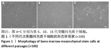 结果:第5,10,15代骨髓间充质干细胞均贴壁生长,第5代细胞表面光滑,呈纺锤形旋涡状生长,类似于成纤维细胞,见图1A;第10代细胞形态和排列方式与第5代基本相同,但局部细胞胞体增大,呈多边形,见图1B;第15代细胞体积增大,边界模糊,细胞呈扁平状或煎蛋状,排列紊乱,见图1C。