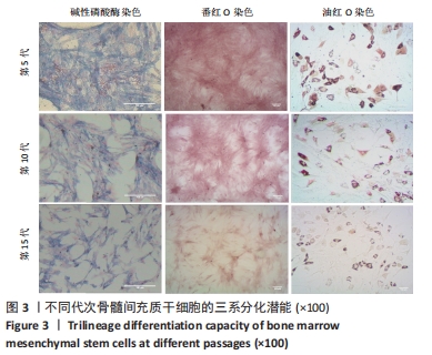图3|不同代次骨髓间充质干细胞的三系分化潜能(×100)