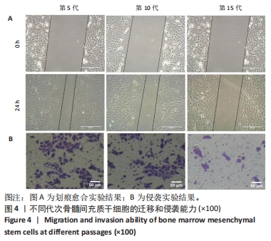 图4|不同代次骨髓间充质干细胞的迁移和侵袭能力(×100)