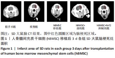 结果:hBMSC移植后3 d,脑CT检查显示模型组、hBMSC+溶剂组、hBMSC移植组和hBMSC+Nrf2抑制剂组均出现脑组织低密度影,即脑梗死灶。如图1所示,脑梗死面积由大到小排序为:模型组(37.5 mm2) > hBMSC+Nrf2抑制剂组(35.9 mm2) > hBMSC+溶剂组(21.6 mm2) > hBMSC移植组(19.8 mm2) > 假手术组(0 mm2)。