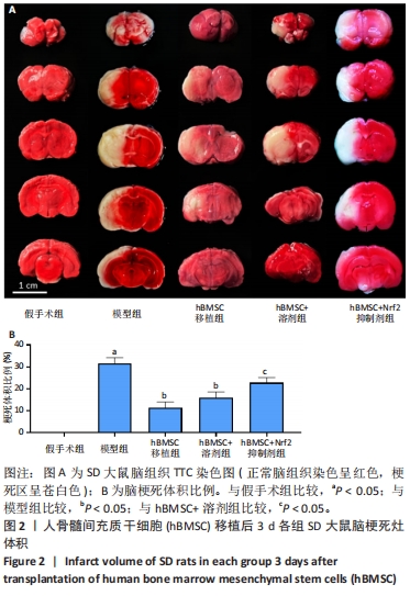 结果:hBMSC移植后3 d,脑切片TTC染色显示模型组、hBMSC+溶剂组、hBMSC移植组和hBMSC+Nrf2抑制剂组均出现苍白色梗死灶,见图2A。通过Image J软件扫描脑片并计算梗死灶体积,与假手术组相比,模型组脑梗死体积增加(P < 0.05);与模型组相比,hBMSC移植组脑梗死体积减少(P < 0.05);hBMSC移植组与hBMSC+溶剂组无显著差异(P > 0.05);与hBMSC+溶剂组相比,hBMSC+Nrf2抑制剂组脑梗死体积增加(P < 0.05),见图2B。该结果提示颅内移植hBMSC有助于减少脑梗灶体积,而在抑制Nrf2表达后,颅内移植hBMSC改善脑梗灶体积的作用不明显。