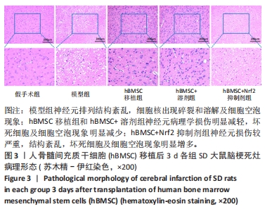结果:hBMSC移植后3 d,苏木精-伊红染色结果如图3所示,假手术组的缺血侧脑组织形态完好;模型组神经元排列结构紊乱,细胞核出现碎裂和溶解及细胞空泡现象,有明显的神经元变性坏死;而经hBMSC移植治疗后大鼠缺血区脑组织神经元病理学损伤明显减轻,坏死细胞及细胞空泡现象明显减少;hBMSC移植组与hBMSC+溶剂组脑组织病理形态没有显著差异;但在左侧脑室注入Nrf2抑制剂后,相较于注入hBMSC+溶剂组大鼠缺血区神经元损伤较严重,结构紊乱,坏死细胞及细胞空泡现象也明显增加。