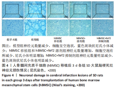 结果:当神经元受损时,尼氏小体减少、解体甚至消失。尼氏染色如图4所示,大鼠未经脑缺血再灌注损伤时胞质中出现丰富的蓝色斑块状尼氏小体(假手术组)。而在脑缺血再灌注损伤后神经元数量减少,细胞呈空泡状,蓝色斑块状尼氏小体减少(模型组)。经hBMSC移植治疗后神经元数量增加,细胞空泡有所减少,尼氏小体明显增加(hBMSC移植组)。但与hBMSC+Nrf2溶剂组相比,hBMSC+Nrf2抑制剂组注入Nrf2抑制剂后神经元数量明显减少,蓝色斑块状尼氏小体也明显减少。hBMSC移植组和hBMSC+溶剂组神经元损伤情况无明显差异。