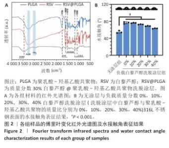 2.1 白藜芦醇洗脱涂层的材料学表征结果 通过傅里叶变换红外光谱对涂层的化学结构进行分析,结果如图2A所示。聚乳酸-羟基乙酸共聚物的红外谱图显示在3 464 cm-1处出现了明显的氧氢峰,在1 750 cm-1处观察到聚乳酸-羟基乙酸共聚物酯键中羰基的伸缩振动特征峰,同时在1 190 cm-1和1 090 cm-1处出现了C-O-C的伸缩振动。白藜芦醇的红外光谱图显示在3 200-3 400 cm-1处出现了宽而强的酚羟基峰,归因于白藜芦醇中多个酚羟基基团的贡献,在1 600 cm-1和1 515 cm-1处出现了明显的苯环骨架C=C的伸缩振动。在白藜芦醇@聚乳酸-羟基乙酸共聚物中,分别出现了聚乳酸-羟基乙酸共聚物和白藜芦醇分子的特征吸收峰,并且白藜芦醇中宽而强的O-H吸收带减弱并略微位移,表明白藜芦醇与聚乳酸-羟基乙酸共聚物通过酚羟基和酯基之间的相互作用实现了结合,证实了洗脱涂层的成功构建,同时也表明聚乳酸-羟基乙酸共聚物有效实现了对白藜芦醇分子的物理包载,并保持了白藜芦醇结构的完整性。 对涂层的润湿性进行了水接触角测试,结果展示如图2B。与316L不锈钢片材相比,负载0%白藜芦醇洗脱涂层的316L不锈钢片材水接触角显著增大,达到了(76.53±2.59)°,这种变化归因于聚乳酸-羟基乙酸共聚物中富含疏水性基团,使得材料表面对水的润湿性降低,接触角增大。而对于负载白藜芦醇洗脱涂层的316L不锈钢片,随着白藜芦醇装载量的增加,材料表面的水接触角逐步减小,这种现象可能是由于白藜芦醇分子中含有多个羟基(-OH),这些羟基能够与水分子形成氢键,从而增强了材料表面的亲水性,进一步证明了白藜芦醇@聚乳酸-羟基乙酸共聚物涂层成功制备并具有明确的特性。"