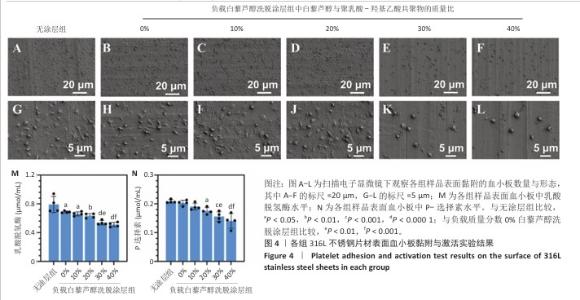 2.2 白藜芦醇洗脱涂层的体外血液相容性评价结果 溶血率直接反映材料对红细胞的破坏性,是判断材料是否适合与血液长期接触的重要指标。各组样品的溶血实验结果如图3所示。316L不锈钢片材与负载质量分数0%,10%,20%,30%,40%白藜芦醇洗脱涂层316L不锈钢片材的溶血率低于国际标准(溶血率< 5%),表明白藜芦醇洗脱涂层材料具有良好的血液相容性。其中,白藜芦醇与聚乳酸-羟基乙酸共聚物基质的结合可能进一步降低了材料表面对红细胞的破坏性,使红细胞在接触涂层表面时保持完整性,减少了膜损伤和溶血的发生。 支架植入体内过程中直接与血液接触,这种界面相互作用对血栓形成和支架功能的长期效果具有决定性影响。血小板黏附和活化程度是评价血管植入物血液相容性的重要指标[43],因此,此次研究通过体外血小板黏附与激活实验评估涂层材料的性能。有研究表明,白藜芦醇能够显著抑制血小板黏附和激活[44-45]。各组样品表面的血小板黏附与激活实验结果如图4显示。扫描电子显微镜观察结果显示,相较于无涂层316L不锈钢片材,负载涂层的316L不锈钢片材表面血小板黏附数量减少,同时保持了血小板的完整形态,未观察到明显的伪足延伸或形态改变,并且随着涂层中白藜芦醇质量分数的增加,血小板黏附数量减少。相较于无涂层316L不锈钢片材组,负载质量分数0%,10%,20%,30%,40%白藜芦醇洗脱涂层316L不锈钢片材组乳酸脱氢酶水平降低,负载质量分数20%,30%,40%白藜芦醇洗脱涂层316L不锈钢片材组P-选择素水平降低,负载质量分数30%,40%白藜芦醇洗脱涂层316L不锈钢片材组乳酸脱氢酶与P-选择素水平均低于负载质量分数0%白藜芦醇洗脱涂层316L不锈钢片材组,差异均有显著性意义,表明白藜芦醇洗脱涂层有效抑制了血小板的黏附与活化。 "