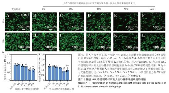 2.4 白藜芦醇洗脱涂层的体外细胞相容性评估结果 支架植入后,内皮细胞损伤会导致内膜修复延迟,增加血栓形成的风险。研究表明,白藜芦醇能够激活内皮一氧化氮合酶、提高一氧化氮水平,促进血管舒张和内皮修复[37];此外,白藜芦醇可抑制氧化应激损伤[31],从而保护内皮细胞功能,增强增殖能力。图6展示了人脐静脉内皮细胞在各组样品表面的增殖检测结果。罗丹明123染色结果显示,相同培养时间下,随着涂层中白藜芦醇质量分数的增加,人脐静脉内皮细胞数量增加。CCK-8检测结果显示,相同培养时间下,负载质量分数20%,30%,40%白藜芦醇洗脱涂层组人脐静脉内皮细胞增殖多于无涂层组,差异有显著性意义;培养24 h,负载质量分数10%,20%,30%,40%白藜芦醇洗脱涂层组人脐静脉内皮细胞增殖多于负载质量分数0%白藜芦醇洗脱涂层组,差异有显著性意义;培养72 h,负载质量分数20%,30%,40%白藜芦醇洗脱涂层组人脐静脉内皮细胞增殖多于负载质量分数0%白藜芦醇洗脱涂层组,差异有显著性意义。表明白藜芦醇能够显著促进内皮细胞的增殖,进而促进血管再生或修复。 支架植入后,平滑肌细胞的异常增殖是支架内再狭窄的主要原因[46-47]。研究表明,白藜芦醇通过阻滞细胞周期(G1或S期)抑制与增殖相关的信号通路(磷脂酰肌醇3-激酶/蛋白激酶B和丝裂原活化蛋白激酶信号通路),降低促增殖因子的表达(血小板源性生长因子)[48-49]。图7展示了人主动脉平滑肌细胞在各组样品表面的增殖检测结果。罗丹明123染色结果显示,相同培养时间下,随着涂层中白藜芦醇质量分数的增加,人主动脉平滑肌细胞数量呈减少趋势。CCK-8检测结果显示,培养24 h,负载质量分数20%,30%,40%白藜芦醇洗脱涂层组人主动脉平滑肌细胞增殖少于无涂层组、负载质量分数0%白藜芦醇洗脱涂层组,差异有显著性意义;培养72 h,负载质量分数30%,40%白藜芦醇洗脱涂层组人主动脉平滑肌细胞增殖少于无涂层组、负载质量分数0%白藜芦醇洗脱涂层组差异有显著性意义。以上结果表明,白藜芦醇可抑制平滑肌细胞过度增殖,可能有助于防止支架植入后内膜增生和再狭窄的发生。 从上述荧光图和CCK-8实验结果可以看出,316L不锈钢片材与负载聚乳酸-羟基乙酸共聚物涂层的316L不锈钢片材对内皮细胞和平滑肌细胞增殖的影响较为平稳,未产生显著的促进或抑制作用。负载白藜芦醇洗脱涂层的316L不锈钢片材对内皮细胞增殖有促进作用,对平滑肌细胞增殖有抑制作用,推测这种效果主要来源于聚乳酸-羟基乙酸共聚物涂层中白藜芦醇的缓释,而非聚乳酸-羟基乙酸共聚物本身。结果表明,白藜芦醇作为洗脱涂层中的活性成分,发挥了促进内皮细胞增殖和抑制平滑肌细胞增殖的作用,从而提高了涂层的生物相容性和治疗效果。 巨噬细胞在支架植入后的炎症反应中起关键作用,巨噬细胞过度增殖会导致慢性炎症,影响支架的长期稳定性。研究表明,白藜芦醇通过调控巨噬细胞增殖可显著降低炎症水平,改善支架植入后的组织修复环境[50]。图8展示了RAW264.7细胞在各组样品表面的增殖检测结果。罗丹明123染色结果显示,相同培养时间下,随着涂层中白藜芦醇质量分数的增加,RAW264.7细胞数量呈减少趋势。CCK-8检测结果显示,培养24 h,负载质量分数20%,30%,40%白藜芦醇洗脱涂层组RAW264.7细胞增殖少于无涂层组、负载质量分数0%白藜芦醇洗脱涂层组,差异有显著性意义;培养72 h,负载质量分数10%,20%,30%,40%白藜芦醇洗脱涂层组RAW264.7细胞增殖少于无涂层组,负载质量分数20%,30%,40%白藜芦醇洗脱涂层组RAW264.7细胞增殖少于负载质量分数0%白藜芦醇洗脱涂层组,差异均有显著性意义。 对血小板黏附与激活、人脐静脉内皮细胞、人主动脉平滑肌细胞和巨噬细胞增殖实验数据进行归一化处理,并绘制热图,结果如图8显示,发现质量分数30%白藜芦醇洗脱涂层表现出最佳的综合性能,因此,选择质量分数30%白藜芦醇洗脱涂层进行后续实验。 "