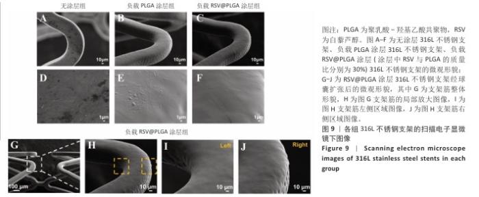2.5 白藜芦醇洗脱涂层的机械性能测试结果 血管支架在体内应用时需要承受体内不同的物理负荷,包括血流的压力、组织的拉伸等,支架需要具有适应这些应力变化的能力,避免因力学性能不足而发生形变或失效。研究表明药物洗脱支架能够达到体内负荷要求[51]。当支架发生形变时,若涂层缺乏足够的延展性,可能会出现开裂或剥离现象,进而导致药物释放不均或失效,甚至损害支架的生物相容性和功能完整性。各组样品的扫描电子显微镜下图像,见图9A-F。316L不锈钢支架表面呈现典型的金属加工形貌,负载0%白藜芦醇洗脱涂层(单纯的聚乳酸-羟基乙酸共聚物涂层)316L不锈钢支架表面形成连续、无裂纹的聚合物薄膜,完全覆盖金属基底,负载质量分数30%白藜芦醇洗脱涂层316L不锈钢支架表面形貌与负载0%白藜芦醇洗脱涂层316L不锈钢支架基本一致,表明药物负载未引起相分离或孔洞缺陷,并且表面均匀一致,未见明显破损或厚度不均的情况。经球囊扩张316L不锈钢支架后,白藜芦醇洗脱涂层未出现涂层剥落、裂缝扩展等问题,能够适应血管支架在应用中的变形要求,见图9G-J。 "