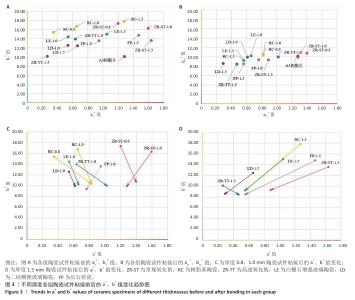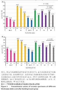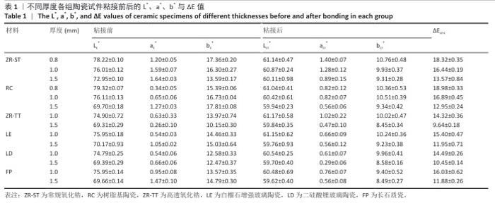 2.1 不同厚度各组陶瓷试件粘接前后的L*、a*、b*值及变化趋势 如表1、图3所示,陶瓷试件的L*值随瓷片厚度的增加而减小,并且在与树脂片粘接后L*值降低,粘接前厚度0.8 mm RC陶瓷试件的L*值最高,粘接后厚度1.0 mm ZR-TT陶瓷试件的L*值最高。粘接后陶瓷试件的a*、b*值随瓷片厚度的增加而减小,在颜色坐标系中表现为粘接后的陶瓷试件颜色随瓷片厚度的增加向蓝绿趋近。除厚度1.0 mm ZR-ST和厚度1.0 mm的FP陶瓷试件外,厚度不超过1.0 mm陶瓷试件与树脂片粘接后的a*值增加;除ZR-TT陶瓷试件外,厚度1.5 mm陶瓷试件与树脂片粘接后的a*值降低。粘接后的陶瓷试件在红-绿坐标轴上的颜色整体向红绿中部趋近,所有厚度陶瓷试件与树脂片粘接后的b*值均降低,表现为粘接后的陶瓷试件在黄-蓝坐标轴上的颜色向蓝色趋近。 2.2 不同厚度各组陶瓷试件粘接前后的ΔEcr-c值 如表1所示,各组陶瓷样本粘接前后的ΔEcr-c值范围为9.64-18.98,并随陶瓷材料厚度的增加而降低。 "