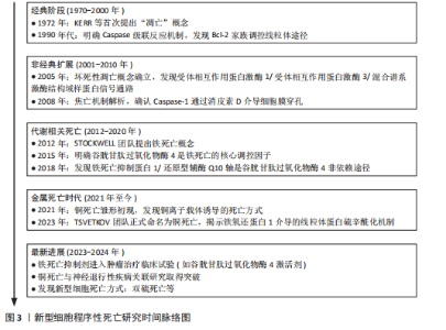 2.1 新型细胞程序性死亡概述 线粒体自噬是通过PTEN诱导激酶1/Parkin通路选择性清除受损线粒体,从而维持能量稳态。在帕金森病中,PTEN诱导激酶1基因突变(如G411S)会导致线粒体自噬受损,进而促进活性氧积累,激活c-Jun氨基末端激酶/p53通路,诱导细胞凋亡[12]。最近的研究发现,Parkin的泛素化修饰能够调控铁死亡关键蛋白谷胱甘肽过氧化物酶4的稳定性,从而形成线粒体自噬与铁死亡之间的交互轴。铁死亡则由System Xc?-谷胱甘肽过氧化物酶4轴的失衡驱动,长链脂酰辅酶A合成酶4/溶血卵磷脂酰基转移酶3通路促进多不饱和脂肪酸的过氧化。在帕金森病中,黑质区的铁过载通过Haber-Weiss反应产生活性氧,并与铜死亡诱导的电子传递链复合体Ⅰ抑制作用相互协作,加剧脂质过氧化[13]。此外核因子E2相关因子2通路的激活可以同时抑制铁死亡和铜死亡,提示抗氧化防御具有全局调控作用。铜死亡依赖于铁氧还蛋白1-二氢硫辛酸转乙酰基酶轴,铜离子直接结合三羧酸循环酶,导致线粒体丙酮酸代谢崩溃和硫辛酰化蛋白聚集。在帕金森病病理进程中已观察到铜离子过度积累现象。铜过载引发Fe-S簇蛋白功能抑制,同时激活长链脂酰辅酶A合成酶4,由此构建了铜-铁代谢的异常循环[14]。线粒体自噬过程的代偿性增强也被证实与此相关。在双硫死亡机制中蛋白质二硫化物异构酶A1-内质网氧化还原酶1信号通路起关键作用。研究显示,细胞骨架蛋白如辅肌动蛋白α4的异常聚集源于二硫键交联反应失调。帕金森病患者存在显著的α-突触核蛋白C端区域中Cys136/Cys145残基的二硫键交联现象,由此引发核因子κB通路激活,随之产生神经炎症反应[15]。值得注意的是,铁死亡标志物谷胱甘肽水平变化能够调控蛋白质二硫化物异构酶A1的氧化还原活性,由此可见双硫死亡与铁死亡间具有潜在联系[16]。作为核心抗氧化枢纽的核因子E2相关因子2通路,其功能具有多重性:谷胱甘肽过氧化物酶4表达上调可抑制铁死亡;铜离子的螯合作用能缓解铜死亡;维持谷胱甘肽水平可以对抗双硫死亡[17-18]。长链脂酰辅酶A合成酶4这一分子靶点值得关注,既参与多不饱和脂肪酸过氧化过程(铁死亡),又能与铜离子结合(铜死亡)。PTEN诱导激酶1/Parkin介导的线粒体自噬功能缺陷时,铁死亡与铜死亡的易感性均会提升。这些证据表明,在帕金森病研究中的4种新型细胞程序性死亡形式(线粒体自噬、铁死亡、铜死亡和双硫死亡)具有重要的研究价值。对这些机制的深入解析不仅能够促进帕金森病病理生理学的认识发展,更为治疗新策略的开发提供可能的分子靶点[19]。 新型程序性死亡时间脉络图见图3。 2.2 线粒体自噬在帕金森病中的作用 2.2.1 线粒体自噬的机制及其功能 研究线粒体自噬机制及其生物学效应对维持线粒体质量具有重要作用[20]。在特定分子标记物及自噬相关蛋白的参与下,功能异常线粒体的选择性清除得以实现[21]。在健康状态下,受损线粒体的标记与包裹过程由PTEN诱导激酶1和Parkin等分子介导完成[22],随后与溶酶体发生融合并降解,该过程不仅消除了异常线粒体,同时参与了细胞能量稳态的调节。氧化应激反应与细胞凋亡调控方面亦显示出重要作用[23]。多项证据表明神经退行性病变、心血管系统疾病乃至恶性肿瘤的发生发展均与线粒体自噬功能障碍存在显著关联[24-25]。以神经退行性疾病为例,阿尔茨海默病与帕金森病等疾病的病理过程中普遍观察到线粒体自噬缺陷。Bcl-2相关卵巢杀手蛋白在Parkin介导的自噬通路中扮演关键角色,研究显示该蛋白缺失会导致线粒体功能障碍及认知能力衰退[26]。在心肌细胞研究中同样发现,通过清除损伤线粒体来维持心脏功能的保护机制依赖于正常的线粒体自噬过程[27-28]。由此可见,深入解析线粒体自噬的分子机制对于疾病治疗策略的开发具有重要价值。后续研究应当着重关注不同疾病背景下线粒体自噬的调控网络及其生物学效应。 2.2.2 线粒体自噬失调与帕金森病的关联 线粒体自噬在帕金森病中的重要性日益受到关注。PTEN诱导激酶1和Parkin是与帕金森病相关的核心蛋白,二者在选择性清除受损线粒体的过程中发挥着重要作用,PTEN诱导激酶1和Parkin突变会导致线粒体自噬功能失调,这与帕金森病的发生紧密相关[29-30]。 线粒体自噬调控失衡已成为帕金森病发病机制的核心环节,PTEN诱导激酶1/Parkin信号轴的功能缺失是导致多巴胺能神经元选择性退变的关键因素。研究显示,赖氨酸乙酰转移酶8介导的Parkin乙酰化修饰对泛素化级联反应具有重要调控作用,其功能缺陷可显著延缓受损线粒体的清除效率[31-32];而赖氨酸乙酰转移酶8调控NSL复合体亚基1通过Unc-51样自噬激活激酶乙酰化调控自噬体形成的分子机制,为解释神经元凋亡特异性增强提供了新视角。近年研究发现,去泛素化酶USP30在帕金森病患者黑质区呈现异常高表达,其通过拮抗Parkin介导的线粒体质量控制,导致线粒体稳态失衡和α-突触核蛋白病理沉积,研究显示:USP30抑制剂(如MTD-101)在动物模型中使线粒体自噬通量提升3倍,但其局限性在于长期抑制可能干扰正常线粒体更新,针对该靶点开发的特异性抑制剂在临床前模型中展现出恢复线粒体自噬通量的治疗潜力,为疾病修饰治疗开辟了新方向[33]。此外,亮氨酸丰富重复激酶2基因突变引发的激酶活性异常,可通过破坏线粒体氧化应激平衡和促进α-突触核蛋白异常聚集双重途径加