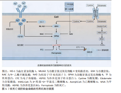 例如伊德本酮(一种合成的辅酶Q10类似物)具有清除自由基、减少脂质过氧化、促进ATP合成等功能,研究显示:在1-甲基-4-苯基-1,2,3,6-四氢吡啶(1-methyl-4-phenyl-1,2,3,6-tetrahydropyridine,MPTP)诱导的帕金森病小鼠中,伊德本酮使黑质多巴胺能神经元存活率从30%提升至65%,运动功能改善50%。但其局限性在于疗效不足:单药治疗未能逆转疾病进展,可能与晚期病理不可逆相关[36]。在线粒体功能障碍与帕金森病发病机制密切关联的背景下,清除受损线粒体的重要途径——线粒体自噬现象引起了研究者们的广泛关注。作为细胞能量感应器的腺苷单磷酸活化蛋白激酶,在能量不足状态下被激活后,能够促进自噬过程的发生,从而实现对神经细胞的保护效应。具有显著膜穿透特性的蜜蜂毒素的主要成分蜂毒肽,在纳米药物递送系统领域展现出广阔应用前景,研究表明蜂毒肽成功携带siRNA分子穿越血脑屏障。蜂毒肽能够激活腺苷单磷酸活化蛋白激酶/哺乳动物雷帕霉素靶蛋白信号通路,进而促进了线粒体自噬过程。在1-甲基- 4-苯基吡啶离子诱导的SH-SY5Y细胞模型中,蜂毒肽能够改善线粒体稳态。使用Bafilomycin A1自噬抑制剂的结果表明,蜂毒肽的神经保护效应确实依赖于自噬过程的激活[37]。需要引起重视的是蜂毒肽固有的毒性问题亟待通过化学结构修饰予以解决。黄蜂毒液中提取的胡蜂毒液多肽同样表现出了对腺苷单磷酸活化蛋白激酶/哺乳动物雷帕霉素靶蛋白信号通路的激活能力,并促进了线粒体自噬与生物发生过程[38],然而不容忽视的是其潜在的免疫原性问题。这些发现为开发基于天然产物的新型帕金森病治疗策略提供了重要启示。由此可见通过调节腺苷单磷酸活化蛋白激酶和哺乳动物雷帕霉素靶蛋白这两条关键信号通路,线粒体自噬过程可能在帕金森病的治疗中发挥神经保护作用。未来研究应着重探索这一机制的详细分子基础,以期开发出更为有效的治疗新方法。 2.3 铁死亡在帕金森病中的机制 2.3.1 铁死亡的生物学基础 铁死亡是新型程序性细胞死亡形式之一[39],其特征表现为铁依赖性脂质过氧化物累积。区别于凋亡与坏死等其他细胞死亡方式,细胞内铁过度积累及活性氧产生与铁死亡的发生密切相关。多个关键生物过程构成了铁死亡的生物学基础,其中包含铁代谢过程、脂质代谢过程以及抗氧化防御机制系统。在神经退行性疾病特别是帕金森病中发挥着重要作用的是铁死亡,铁的异常堆积是神经元损伤的关键因素之一[40]。谷胱甘肽水平在细胞内的变化、谷胱甘肽过氧化物酶4等抗氧化因子的表达量变化同样对铁死亡的调控过程具有关键影响[41-42]。深入探究铁死亡的分子机制有助于为神经退行性疾病如帕金森病的治疗策略提供潜在的新靶点。 2.3.2 铁代谢异常与帕金森病的关系 帕金森病患者黑质区域中普遍存在铁异常积聚现象。作为神经元损伤的重要诱因,铁的过量堆积不仅导致氧化应激反应的发生,更促进了铁死亡过程的进展性变化。热休克因子结合蛋白1和血红素加氧酶1通过多通路交互作用调控铁死亡与帕金森病病程的发展[43],这一发现具有重要意义。引发脂质过氧化反应的铁积累现象,可观察到多不饱和脂肪酸富集化的特征表现。在神经元膜磷脂中,经由脂氧合酶和花生四烯酸15-脂氧合酶的作用,花生四烯酸与腺苷酰化花生四烯酸-磷脂酰乙醇胺转化为脂质自由基。研究显示脂氧合酶的激活作用会引起α-突触核蛋白聚集化的形成,同时诱导花生四烯酸15-脂氧合酶发生膜转位现象并催化多不饱和脂肪酸的氧化过程。线粒体电子传递链复合物Ⅰ的抑制效应(类似鱼藤酮作用机制)增加了超氧阴离子的生成量[44-45],这一机制可解释细胞膜及细胞器受损的病理过程。转铁蛋白和铁调素等铁代谢相关蛋白的功能失调性表现在帕金森病发病机制中具有显著影响,这些蛋白的表达异常可能加剧铁的积累程度[46],由此可见针对铁代谢异常的干预性措施可能成为帕金森病治疗的新策略方向。 2.3.3 针对铁死亡的干预策略及其研究进展 铁死亡作为一种铁依赖性脂质过氧化驱动的细胞死亡形式,在帕金森病多巴胺能神经元丢失中发挥着关键作用。目前的干预策略主要集中在铁代谢调控与抗氧化防御增强两个方向。 首先,在铁代谢调控策略方面,铁螯合剂去铁胺通过结合游离铁来抑制芬顿反应,临床前研究显示其能够降低帕金森病模型中黑质的铁沉积,并减少α-突触核蛋白寡聚体的形成[47],但长期使用有贫血风险。在铁转运调控方面,抑制转铁蛋白受体1可减少铁的摄入,siRNA沉默铁转蛋白受体1使神经元存活率提升62%。 其次,激活抗氧化通路,谷胱甘肽系统的前体补充,如N-乙酰半胱氨酸,能够绕过胱氨酸/谷氨酸反向转运系统的限制,促进谷胱甘肽合成。脂溶性抗氧化剂如维生素E嵌入细胞膜,阻断脂质过氧化链式反应,延缓帕金森病模型的运动障碍进展[48]。辅酶Q10通过稳定线粒体电子传递链复合体减少活性氧的生成,但其血脑屏障穿透率仅为5%-8%,限制了它在中枢神经系统的疗效。在核因子E2相关因子2通路激活方面,萝卜硫素能够诱导核因子E2相关因子2核转位,并上调血红素加氧酶1、NAD(P)H醌氧化还原酶1等抗氧化基因,临床前研究显示其可减少黑质神经元的丢失。二甲双胍通过腺苷酸活化蛋白激酶/核因子E2相关因子2轴增强转录活性,目前正在进行帕金森病的预防性临床试验。 第三,