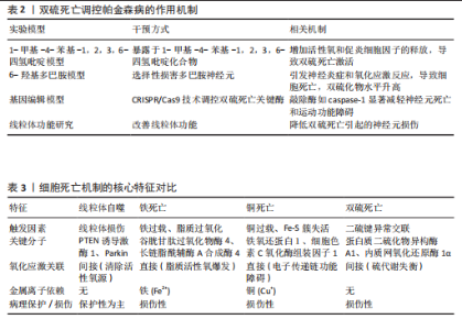 记物特征[57-58]。多巴胺能神经元凋亡过程可能与帕金森病中的铜死亡存在直接联系,该过程受到3个关键因素影响:铜离子缺乏状态、谷胱甘肽含量下降以及线粒体功能受损[59-60]。临床观察与动物实验显示通过干预铜代谢状态可能成为帕金森病治疗新途 径[61-62]。正在进行中的临床试验致力于评估铜调节疗法在阿尔茨海默病及亨廷顿舞蹈症等其他神经退行性疾病中的疗效[63-64]。由此可见铜死亡在帕金森病中的作用机制仍需开展更深入的探究工作,以期获得具有临床应用价值的治疗策略。后续研究重点应当集中于2个方面:铜代谢调控网络的解析及其在神经保护效应中的潜在应用前景。 2.4.3 铜死亡相关的治疗潜力 经Cu2+处理过的人源细胞系(如HeLa与HAP1型),其线粒体脂酰化蛋白组分(包括二氢硫辛酸转乙酰基酶及二氢硫辛酸琥珀酰转移酶等)与铜离子发生特异性结合现象,进而引发蛋白质异常聚集并最终导致线粒体呼吸链功能受损[65]。SN4741型多巴胺能神经元中的铁氧还蛋白1基因被敲除后,铜依赖性脂酰化过程呈现明显阻断态势,同时线粒体膜电位下降幅度及活性氧生成量均有所减轻。在动物模型层面,采用MPTP诱导的帕金森病小鼠经铜螯合剂(例如Clioquinol类)干预后,中脑黑质区的铜沉积量显著降低。与此同时铜离子转运ATP酶α/β肽转运系统的功能性得到恢复,且与铜死亡相关的硫辛酸合成酶蛋白表达水平呈现下调趋势[66]。由此可见此类螯合剂的应用不仅提升了多巴胺能神经元的存活比例,更改善了实验对象的运动功能表现[54]。同时铜螯合剂的实际应用仍存在诸多制约因素,典型表现为中枢神经系统渗透能力较弱——以曲恩汀为例,其在脑组织中的浓度仅维持在血浆浓度的5%-10%范围内,长期给药还可能导致锌、铁等必需微量元素的缺乏症状。铜螯合过程可能干扰超氧化物歧化酶1、环氧化酶等铜依赖性酶的生理活性,从而加重能量代谢紊乱程度。近期研究揭示热休克蛋白家族成员在调控α-突触核蛋白聚集及维持细胞存活方面展现出潜在的治疗价值[67]。基于现有治疗策略的整合优化,通过精确靶向铜代谢相关信号传导网络的新型干预手段或将成为未来帕金森病治疗的重要突破口。这些发现不仅为深入解析帕金森病的发病机制提供了崭新视角,更为创新性治疗方案的开发奠定了坚实的理论基础。铜死亡调控帕金森病的作用机制见表1。 2.5 双硫死亡在帕金森病中的角色 2.5.1 双硫死亡的定义及机制 双硫死亡也是新型细胞死亡模式,其分子机制涉及细胞内双硫键的断裂与形成过程[68]。区别于凋亡、坏死及铁死亡等已知细胞死亡类型,双硫死亡的显著特征在于对硫化物浓度变化和氧化还原稳态的依赖性。在帕金森病病理条件下,神经元的存活状态与功能表现可能受到双硫死亡对氧化还原平衡调节作用的显著影响。线粒体功能障碍现象、氧化应激反应以及铁代谢异常情况与双硫死亡过程具有密切关联性[69],这些病理因素的重要性在帕金森病疾病进展中已被多项研究所证实[59,70]。 2.5.2 双硫死亡与神经退行性病变的关系 在帕金森病病理学进程中,神经元死亡现象及功能异常与双硫死亡机制具有显著相关性。帕金森病患者脑组织中存在氧化应激反应增强和铁元素异常沉积现象,这些病理变化或可成为双硫死亡发生的潜在促进因子。细胞内脂质过氧化作用被双硫死亡所加剧,活性氧簇生成量随之上升,神经细胞损伤程度因而加重。值得注意的是,α-突触核蛋白聚集体的形成与双硫死亡存在关联性,该蛋白异常聚集作为帕金森病典型病理特征而广受关注[71-72]。由此可见深入探究双硫死亡的分子机制学特征,或将开辟帕金森病治疗学研究的新途径。 2.5.3 双硫死亡相关研究的最新进展 近年来,关于双硫死亡现象在帕金森病发生发展过程中的作用机制性研究,逐渐受到学者们的广泛关注。值得注意的是,多项实验性研究已证实,当对双硫死亡相关信号通路进行特异性抑制时,能够显著改善帕金森病模型小鼠的运动功能缺陷和神经元损伤程度。在神经科学研究领域,6-羟基多巴胺和MPTP这两种化学物质被普遍应用于构建帕金森病动物模型,在这些模型中观察到双硫死亡标志物的表达水平变化与神经元损伤程度呈现"
