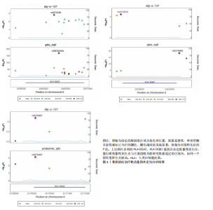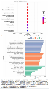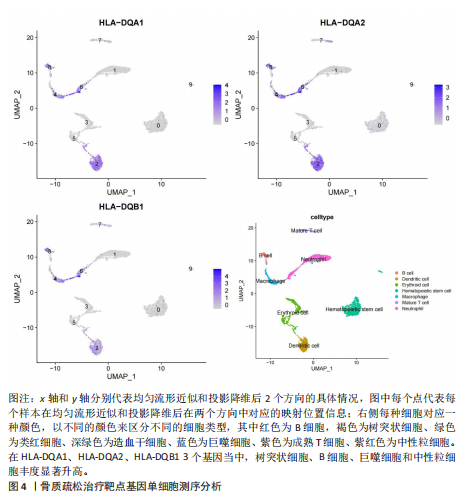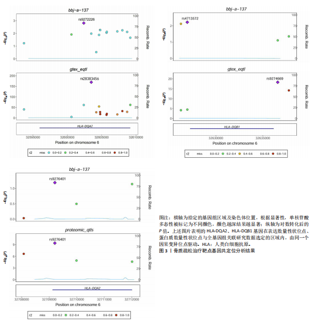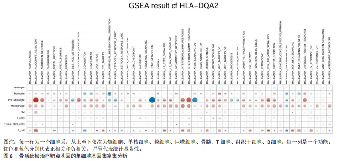 2.1 表达数量性状位点分析结果 去除掉重复的基因后,从FinnGen数据库筛选出了34个与骨质疏松症具有显著因果关系的基因(PFDR < 0.05,PHEIDI > 0.05);从日本生物银行数据库筛选出了30个与骨质疏松症具有显著因果关系的基因(PFDR < 0.05,PHEIDI > 0.05)。进行了全面的文献检索,并将尚未报道过与骨质疏松症相关的基因以及在2个数据库分析结果中共有的基因作为显著结果,最后筛选出的5个基因分别为人类白细胞抗原(human leukocyte antigen,HLA)等位基因HLA-DQA1、HLA-DQA2、HLA-DRB5、HLA-DQB1、HLA-DQB2。详见图1,2及表2。 2.2 蛋白质数量性状位点验证 为了进一步确定筛选出的基因作为骨质疏松症治疗靶点的可能性,使用血浆蛋白质数量性状位点数据进行验证。在初步分析中,仅有基因HLA-DQA2在蛋白质水平上得到了验证,详见表2。 2.3 共定位分析结果 筛选出的5个基因中,HLA-DRB5、HLA-DQA1和HLA-DQB2无完整的摘要水平数据可用,因此无法进行共定位分析。其余2个基因HLA-DQA2(PPH4=0.98)和HLA-DQB1(PPH4 =0.98)在基因水平上具有共定位证据,表明上述基因与骨质疏松症风险之间存在共同因果变异;其中HLA-DQA2在蛋白质水平上同样具有共定位证据的支持(COLOC PPH4=0.80),共定位结果的区域关联详见图3。 2.4 骨质疏松症中细胞类型鉴定 骨质疏松症单细胞数据集分为7个细胞群,分别为B细胞、树突状细胞、类红细胞、造血干细胞、巨噬细胞、成熟T细胞、中性粒细胞;与其他细胞类型相比,树突状细胞、B细胞、巨噬细胞和中性粒细胞在骨质疏松免疫微环境中的丰度显著更高,详见图4。 2.5 基因富集分析及功能富集分析 对从基于汇总数据的孟德尔随机化分析中鉴定的基因进行功能富集分析;根据归一化富集评分,显示前10个KEGG通路和前30个基因本体论条目,详见图5。 2.6 单细胞基因集富集分析 结果显示,基因HLA-DQA2在T细胞及干扰素γ途径上活化,在Kras基因、亚铁血红素途径上抑制,详见图6。"
