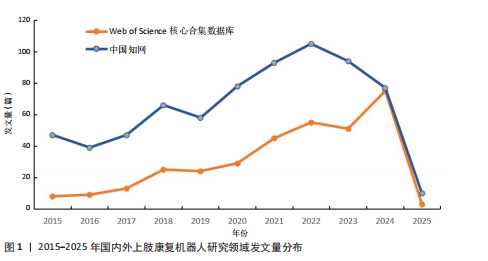 RESULTS AND CONCLUSION: (1) A total of 1 054 articles were included, involving 659 authors. The United States held the highest overall ranking in terms of both research publication volume and centrality in this field. Among the contributing institutions, Northeast University and Univ Shanghai Sci&Technol ranked the highest in publication volume. Visualization analysis indicated an overall upward trend in upper limb rehabilitation robotics research, yet revealed limited collaboration among researchers and institutions. Key research domains encompassed core technological methodologies, robot design and optimization, control strategies and algorithms, clinical application and evaluation, and integration of emerging technologies and interdisciplinary approaches. (2) Future research can focus on technological fusion and intelligent system upgrades, interdisciplinary collaborative innovation, and refinement of clinical applications to drive sustained advancements in this field.