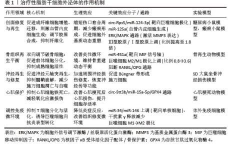 2.1 脂肪干细胞外泌体的作用机制 脂肪干细胞外泌体促进成纤维细胞迁移和增殖,同时刺激血管内皮细胞形成新生血管网显著缩短伤口愈合周期,调节胶原蛋白合成,减少瘢痕形成。YIN等[16]发现脂肪干细胞外泌体可以通过circ-Rps5/miR-124-3p轴调节巨噬细胞极化并促进糖尿病小鼠伤口愈合。LIANG等[17]证实脂肪干细胞外泌体通过转移miR-125a促进血管内皮细胞生成。WANG等[18]将脂肪干细胞外泌体通过小鼠尾静脉输注后,发现小鼠切口瘢痕体积缩小,Ⅲ型胶原与Ⅰ型胶原比例提高至1.8倍,有效抑制了成纤维细胞向肌成纤维细胞分化,减少α-平滑肌肌动蛋白表达,阻断纤维化进程,激活细胞外调节蛋白激酶/丝裂原活化蛋白激酶信号通路(磷酸化水平提升3.1倍),诱导皮肤真皮成纤维细胞表达基质金属蛋白酶3,促进细胞外基质动态重塑。 脂肪干细胞外泌体既促进前体细胞分化又抑制成熟细胞活性,维持骨重建动态平衡。LI等[19]发现脂肪干细胞外泌体通过递送miR-451a靶向抑制迁移抑制因子信号轴,重塑巨噬细胞极化平衡(M2/M1比例从0.8提升至3.6),进而改善炎性微环境并促进骨再生。REN等[20]则证实脂肪干细胞外泌体通过双重调控机制——抑制骨细胞凋亡及阻断核因子κB受体活化因子配体/骨保护素信号轴,有效抑制骨细胞介导的破骨细胞生成。 脂肪干细胞外泌体诱导神经元细胞的轴突延伸,抑制髓鞘崩解进程,促进神经元轴突再生,加速周围神经的修复。尹刚等[21]构建了SD大鼠神经损伤模型,并于实验组大鼠尾静脉内注射脂肪干细胞外泌体进行干预,注射结束1周后处死大鼠并取损伤坐骨神经上下2 cm进行观察,结果发现:脂肪干细胞外泌体通过减少施万细胞凋亡、减轻细胞自噬并促进Büngner带形成等,在周围神经损伤修复过程中起重要作用。 脂肪干细胞外泌体对心肌梗死损伤的心肌细胞表现出更显著的保护作用。LIU等[22]发现缺氧预处理脂肪干细胞外泌体通过激活circ-Stt3b/miR-15a-5p/谷胱甘肽过氧化物酶4信号通路并抑制铁死亡,从而有效改善心肌梗死后的心肌损伤。 脂肪干细胞外泌体调控免疫微环境,诱导T淋巴细胞程序性死亡,重塑巨噬细胞极化状态。BLAZQUEZ等[23]发现脂肪干细胞外泌体可显著抑制T淋巴细胞分化与活化过程,并降低体外刺激条件下T淋巴细胞的增殖活性及干扰素γ释放水平。DOMENIS等[24]也发现脂肪干细胞的抗炎和免疫抑制活性主要归因于炎症微环境的动态调控,当脂肪干细胞预先用促炎因子肿瘤坏死因子α和干扰素γ处理时,脂肪干细胞外泌体中miR-34和miR-146的表达显著上调,通过靶向调控巨噬细胞微环境中的单核细胞,诱导M1型巨噬细胞向抗炎M2型极化。 综上所述,脂肪干细胞外泌体在创面修复、骨再生、神经再生与修复、心肌保护、免疫微环境调控等各个领域发挥了重要作用,见表1。"