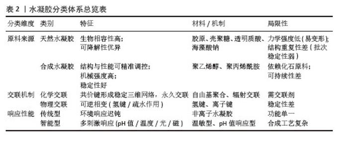 2.2 水凝胶递送系统 2.2.1 水凝胶的定义及特征 水凝胶作为一种新型高分子材料,是通过化学或物理交联技术将单体分子连接成三维亲水网络的聚合物体系,其独特的亲水性网状结构赋予了这类材料优异的吸水保水性能,同时具备生物软组织般的柔性特征。水凝胶发展历史可追溯至20世纪60年代,当时WICHTERLE团队[25]首次开发出聚羟乙基甲基丙烯酸甲酯水凝胶材料,通过自由基聚合工艺将2-羟乙基甲基丙烯酸甲酯单体交联成凝胶状物质,并成功应用于隐形眼镜制造领域。 2.2.2 水凝胶的分类 水凝胶依据原料来源、交联机制及响应性能可分为三大体系:①按原料来源划分:可分为天然与合成两大类,天然水凝胶以胶原、壳聚糖、透明质酸等天然高分子为基质,凭借优异的生物相容性和可降解性,在组织工程和药物缓释领域具有独特优势,但其力学强度较低、结构重复性差的局限性也制约了应用拓展;合成水凝胶如聚乙烯醇、聚丙烯酰胺等,则通过化学合成手段实现了结构与性能的精准调控,在机械强度、稳定性等方面显著优于天然材料,然而其单体多依赖化石资源,在环保性和可持续性方面存在短板。②从交联机制角度划分:可分为化学交联与物理交联两大类,化学交联通过共价键形成稳定的三维网络,赋予材料永久交联特性;物理交联则依赖氢键、范德华力等非共价作用,使凝胶在温度、离子强度等刺激下呈现可逆相变。③从响应性能角度划分:可分为传统型与智能型两大类,传统水凝胶对外界刺激反应迟钝,而智能水凝胶能够根据pH值、温度、光、磁场等信号发生结构或性能变化[26],这些智能特性使水凝胶在化学传感、精准医疗等领域展现出巨大潜力,推动其从传统材料向智能响应体系的创新升级[27]。各种不同类型水凝胶分类见表2。"