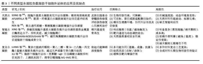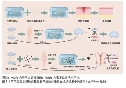 2.2.3 天然水凝胶负载脂肪干细胞外泌体 SONG等[28]研究报道了一种新型细胞外基质水凝胶外泌体(细胞外基质水凝胶)的开发,通过将脂肪干细胞外泌体载入细胞外基质水凝胶中构建而成。在伤口局部注射后,于生理温度(≈37 ℃)下形成水凝胶。脂肪干细胞外泌体从细胞外基质水凝胶中持续释放,从而在伤口部位维持较高的局部浓度,具有良好的生物相容性和可降解性。体内外实验结果均表明,细胞外基质水凝胶治疗可有效减轻炎症反应,促进血管生成、胶原沉积及细胞增殖迁移,进而加速伤口愈合进程。 AFSARTALA等[29]基于细胞外基质的胶原和纤维蛋白水凝胶封装脂肪干细胞外泌体,可促进急性脊髓损伤大鼠受损神经再生,并减轻脊髓损伤引起的中枢神经性疼痛。REN等[30]开发了一种可注射的氧化透明质酸-聚赖氨酸(OHA-PL)水凝胶,能够便捷负载脂肪干细胞外泌体,并提高其在生理条件下的滞留能力。透明质酸-聚赖氨酸-脂肪干细胞外泌体水凝胶通过微创方式移植到缺血心肌,可在心肌梗死早期清除细胞内外活性氧,调节巨噬细胞极化,减轻炎症反应;在心肌梗死后期可有效减少心肌纤维化和心室重构,促进血管生成,并恢复电生理功能。 天然水凝胶负载脂肪干细胞外泌体体系优势突出:①以细胞外基质、胶原等天然成分为基质,生物相容性与可降解性俱佳,能减少免疫排斥;②水凝胶自身可模拟生理微环境,与外泌体的抗炎、促修复功能形成协同效应;③可注射特性适配局部微创给药,原位成胶还能实现外泌体持续释放以维持靶部位高浓度,且在多领域均有治疗潜力,见图3。不过天然水凝胶负载脂肪干细胞外泌体的局限性亦不容忽视:①天然水凝胶机械强度较弱,在承重部位或动态环境中易降解变形;②天然材料来源差异可能造成性能波动,不利于标准化生产;③缺乏智能响应特性,对复杂病理微环境的动态适配能力有限,且部分研究对分子交互机制的解析不够深入。"