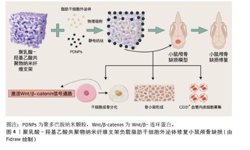 2.3 金属有机框架 2.3.1 金属有机框架定义及特征 金属有机框是一类通过无机金属单元(离子、离子簇或多核配合物)与有机配体自组装形成的多孔有机-无机杂化网络材料,其结构可延伸为一维、二维或三维[36]。在金属中心与有机配体通过配位键和共价键结合的过程中,会形成具有超高表面积和孔隙比率(可达90%)的金属有机框架晶体[37]。这类材料的制备方法相对简便,常见的合成手段包括溶剂热合成、电化学合成、机械研磨、微波与超声辅助合成以及高通量合成等[38]。此外,通过对金属有机框架进行合成后修饰,能够有效提升结构稳定性,精准调控功能特性,甚至赋予材料新的附加性能。金属有机框架整合了有机与无机组分的双重优势,其核心特点在于可通过灵活改变金属节点和(或)有机连接体的类型来调控材料的化学组成。由于组分在几何构型、尺寸大小及功能特性上具有高度可调性,金属有机框架的结构设计理论上具有无限可能性[39]。目前,已有大量金属有机框架材料被开发和研究,其中具有代表性的体系包括MIL(materials of institut lavoisier)系列、UiO(university of oslo)系列以及沸石咪唑酯骨架(zeolitic imidazolate frameworks,ZIF)系列,这种结构多样性使得金属有机框架在气体吸附、催化、药物递送等领域展现出广阔的应用潜力[40-41]。 2.3.2 金属有机框架负载脂肪干细胞外泌体 KANG等[42]成功开发了一种聚乳酸-羟基乙酸共聚物/镁离子-没食子酸-金属有机框架复合支架(PLGA/Exo-Mg-GA MOF),通过结合脂肪干细胞外泌体、镁离子和没食子酸的协同作用,构建了独特的纳米结构界面,旨在同步提升材料的成骨诱导、血管生成促进及抗炎特性。实验数据表明,该复合支架在体外对人骨髓间充质干细胞的成骨分化以及人脐静脉内皮细胞的血管形成均表现出显著的增强效应;进一步研究发现,支架中缓释的脂肪干细胞外泌体可被共培养细胞有效摄取,通过维持骨移植区域的微环境稳定、保障局部血供,进而加速成骨细胞分化进程并推动骨组织重建;动物实验方面,通过大鼠颅骨缺损模型验证了聚乳酸-羟基乙酸共聚物/镁离子-没食子酸-金属有机框架复合支架在体内能够显著促进新生骨组织生成,并实现良好的骨整合效果。 金属有机框架负载脂肪干细胞外泌体的优势:结构与性能的调控灵活性突出,可通过组分设计实现功能的精准定制;多孔特性便于负载外泌体、离子等活性物质并实现缓释,从而达成多成分的协同效应;制备手段丰富且支持后期修饰,有利于优化材料稳定性并赋予其额外性能。不足之处在于:部分金属有机框架稳定性欠佳,体内长期应用可能产生不利影响;复合支架的制备涉及多组分整合,工艺复杂程度较高。 2.4 人工合成高分子聚合物支架 2.4.1 人工合成高分子聚合物支架定义及特征 人工合成高分子聚合物支架是通过化学合成方法制备的三维多孔结构材料,广泛应用于生物医学与组织工程领域。此类材料通常选择生物相容性良好的可降解或稳定高分子,如聚乳酸、聚乙醇酸、聚乳酸-羟基乙酸共聚物及聚己内酯等,具备可调控降解速率、机械强度及生物功能的特性[43]。人工合成高分子聚合物的制备方法多样,包括静电纺丝法(构建纳米纤维模拟细胞外基质)、3D打印技术(定制复杂结构)、溶剂铸造/粒子沥滤法(调控孔隙率)及相分离法等,以满足不同应用需求[44]。这类支架的结构特点突出多孔性与可设计性,高孔隙率(50%–90%)和连通孔道支持细胞迁移与物质运输,孔径大小可根据组织再生需求(如骨组织工程需100–500 μm大孔径)灵活调整,通过表面功能化修饰(如接枝生长因子)或力学性能优化,可进一步提升生物相容性与细胞黏附能力。在应用方面,人工合成高分子聚合物支架已覆盖骨组织修复、药物缓释、神经再生及皮肤修复等 领域[45]。 2.4.2 人工合成高分子聚合物支架负载脂肪干细胞外泌体 GANDOLFI等[46]开发了一种负载脂肪干细胞外泌体的矿物增强型聚乳酸基骨修复材料,采用热致相分离技术制备了两种不同矿物配比的多孔支架(PLA-10CaSi-10DCPD和PLA-5CaSi-5DCPD),通过环境扫描电镜分析显示,支架具有直径10-30 μm的规则孔隙结构,且在模拟体液中浸泡28 d后仍能保持稳定的三维多孔形态,同时表面发生动态矿化反应,为成骨细胞提供了仿生微环境。体外实验表明,矿物掺杂显著增强了脂肪干细胞的成骨分化能力,其中PLA-10CaSi-10DCPD配方通过硅酸钙与二水合磷酸氢钙的协同作用表现出更优的生物活性;进一步研究发现,外泌体负载吸附于支架表面,通过旁分泌机制显著上调成骨相关基因(Ⅰ型胶原A1、骨桥蛋白、骨钙素等)的表达水平,与矿物掺杂产生协同效应;生物相容性测试显示,两种支架均支持细胞的黏附与增殖,其中高矿物含量支架在促进细胞外基质矿化方面表现突出。研究证实,将生物活性矿物与外泌体功能化相结合的策略,可通过模拟天然骨组织的成分与结构特征,有效激活干细胞的成骨分化潜能。 LI等[47]开发了一种基于脂肪干细胞外泌体的智能型骨修复系统,通过构建聚多巴胺修饰的聚乳酸-羟基乙酸共聚物纳米纤维支架,实现了生物活性因子的可控递送与骨再生微环境的精准调控;采用静电纺丝技术制备了具有仿生结构的聚多巴胺涂层聚乳酸-羟基乙酸共聚物纳米纤维支架,并通过物理吸附法将外泌体稳定锚定于支架表面。体外实验显示,该复合体系可显著促进人骨髓间充质