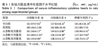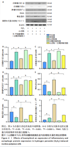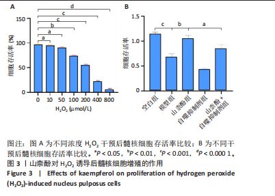 2.2 细胞实验结果 2.2.1 山柰酚对H2O2诱导后髓核细胞增殖的作用 CCK-8检测结果显示,随着H2O2浓度的升高(0-800 μmol/L 髓核细胞存活率降低,当H2O2浓度> 200 μmol/L时,髓核细胞存活率较对照组下降> 50%,见图3A,为避免细胞过度损伤,选取细胞存活率为55.32%的200 μmol/L H2O2建立髓核细胞氧化应激模型。 CCK-8检测结果显示,模型组髓核细胞存活率低于空白组、山柰酚组(P < 0.001,P < 0.01),山柰酚+自噬抑制剂组髓核细胞存活率低于山柰酚组(P < 0.05),见图3B。 2.2.2 山柰酚对H2O2诱导后髓核细胞炎症与自噬相关蛋白表达的影响 Western blot检测结果显示,与空白组比较,模型组髓核细胞内白细胞介素1β、白细胞介素6、肿瘤坏死因子α、微管相关蛋白轻链3Ⅱ/Ⅰ蛋白表达升高(P < 0.05,"