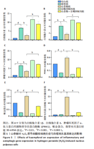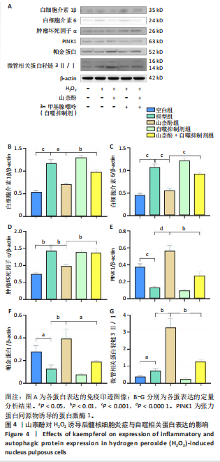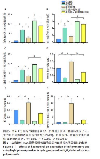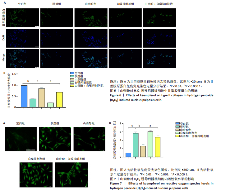 P < 0.01,P < 0.001),PINK1、帕金蛋白的蛋白表达降低(P < 0.001,P < 0.05);与模型组比较,山柰酚组内白细胞介素1β、白细胞介素6、肿瘤坏死因子α蛋白表达降低(P < 0.01,P < 0.001),微管相关蛋白轻链3Ⅱ/Ⅰ、帕金蛋白、PINK1蛋白表达升高(P < 0.01,P < 0.000 1);与山柰酚组比较,山柰酚+自噬抑制剂组髓核细胞内白细胞介素1β、白细胞介素6、肿瘤坏死因子α蛋白表达升高(P < 0.01,P < 0.001),微管相关蛋白轻链3Ⅱ/Ⅰ、帕金蛋白、PINK1蛋白表达降低(P < 0.05,P < 0.01),见图4。结果表明,在椎间盘退变过程中自噬作用可能被激活,但激活程度有限,而山柰酚可明显提高髓核细胞的自噬水平。 2.2.3 山柰酚对H2O2诱导后髓核细胞炎症与自噬相关基因表达的影响 RT-qPCR检测结果显示,与空白组比较,模型组髓核细胞内白细胞介素1β、白细胞介素6、肿瘤坏死因子α、微管相关蛋白轻链3B mRNA表达升高(P < 0.01,P < 0.000 1),帕金蛋白、PINK1 mRNA表达降低(P < 0.000 1);与模型组比较,山柰酚组髓核细胞内白细胞介素1β、白细胞介素6、肿瘤坏死因子α mRNA表达降低(P < 0.01,P < 0.001),微管相关蛋白轻链3B、帕金蛋白、PINK1 mRNA表达升高(P < 0.001,P < 0.000 1);与山柰酚组比较,山柰酚+自噬抑制剂组髓核细胞内白细胞介素1β、白细胞介素6、肿瘤坏死因子α mRNA表达升高(P < 0.01,P < 0.001),微管相关蛋白轻链3B、帕金蛋白、PINK1 mRNA表达降低(P < 0.01,P < 0.001),见图5。结果表明,氧化应激损伤抑制了线粒体自噬核心通路的活性,导致受损线粒体累积,而山柰酚可能通过激活PINK1/帕金蛋白信号轴促进受损线粒体的选择性清除,恢复线粒体稳态,同时增强自噬通量强化了线粒体质量控制能力。 2.2.4 山柰酚对H2O2诱导后髓核细胞中Ⅱ型胶原蛋白的影响 免疫荧光染色结果显示,模型组髓核细胞内Ⅱ型胶原蛋白表达低于空白组、山柰酚组(P < 0.000 1),山柰酚+自噬抑制剂组髓核细胞内Ⅱ型胶原蛋白表达低于山柰酚组(P < 0.01),见图6。结果表明,山柰酚可能通过增加Ⅱ型胶原蛋白表达间接保护髓核细胞外基质稳态。"