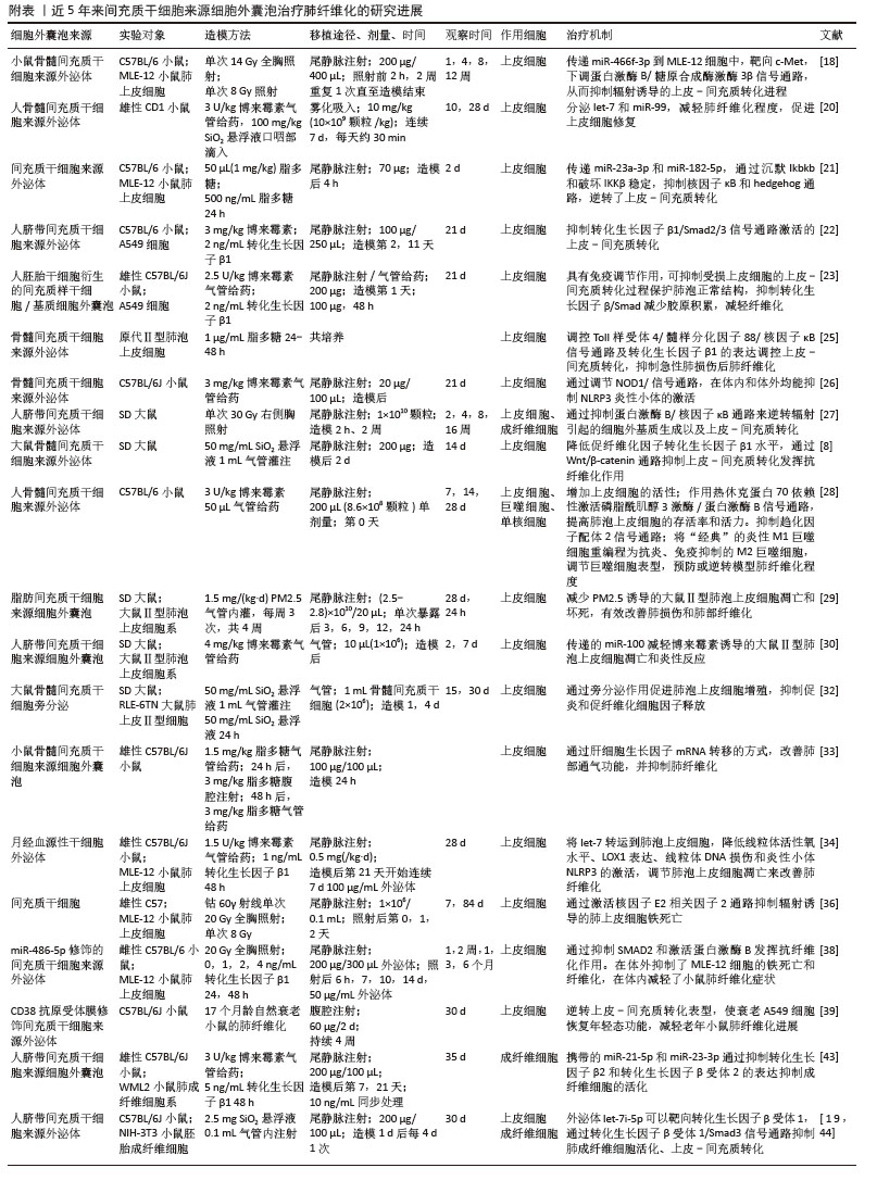 2.2.1 抑制上皮-间充质转化/抗凋亡坏死进而维持肺泡上皮稳态 肺纤维化的病理重构始于肺泡上皮细胞的级联功能失调,核心表现为:上皮-间充质转化进程中,上皮细胞通过表型转化(E-cadherin下调> 80%)获得间充质特性,分泌转化生长因子β/肿瘤坏死因子α等因子直接导致细胞外基质异常沉积(基质金属蛋白酶9水平升高5-8倍);在遗传易感个体中,反复微损伤导致再上皮化障碍(修复周期延长2.3倍),形成Ⅰ/Ⅲ型胶原异常交联[占比达(78.0±5.2)%]的恶性修复模式;血小板衍生生长因子受体β/成纤维细胞生长因子受体1信号轴异常激活(磷酸化水平增加3.5倍),驱动α-平滑肌肌动蛋白(表达量升高4.2倍)等间充质标志物表达,加速肺泡空间纤维化重塑[17]。针对上皮-间充质转化进程的靶向调控、再生微环境重建及异常信号通路阻断,已成为干预肺纤维化病理进展的三大核心策略。 研究表明,不同间充质干细胞来源细胞外囊泡可通过多通路协同抑制上皮-间充质转化进程,从而发挥抗肺纤维化作用。①通过传递miR-466f-3p活性分子靶向调控蛋白激酶B/糖原合成酶激酶3β信号轴[18],抑制SNAIL和Twist蛋白活性,逆转上皮-间充质转化相关标志物表达(E-cadherin表达提升2.1倍,α-平滑肌肌动蛋白/N-cadherin降低60%);let-7i-5p靶向c-Met拮抗转化生长因子β驱动的细胞外基质沉积及成纤维细胞迁移活化(迁移率降低70%)[19-20];另一研究显示,递送的miR-23a-3p和miR-182-5p通过沉默Ikbkb基因并破坏核因子κB抑制蛋白激酶β蛋白稳定性,抑制核因子κB和Hedgehog通路的过度激活,协同逆转上皮-间充质转化进程[21];②通过抑制转化生长因子β1/Smad2/3信号通路及其下游上皮-间充质转化进程,显著降低促纤维化递质表达,且在早期干预效果更为显著[22-24];③调控Toll样受体4/髓样分化因子88/核因子κB、NOD1/核因子κB/NOD样受体家族Pyrin域蛋白3(NOD-like receptor family pyrin domain containing 3,NLRP3)炎症信号级联反应,抑制蛋白激酶B/核因子κB通路,减轻肺泡上皮-间充质转化[25-27];④阻断Wnt/β-catenin通路过度激活,通过糖原合成酶激酶3β/β-catenin轴抑制二氧化硅诱导的上皮-间充质转化进展[8]。这些研究共同揭示间充质干细胞来源细胞外囊泡可通过多miRNA组合策略,同时干预SNAIL、β-catenin等关键上皮-间充质转化调控因子,靶向转化生长因子β、Wnt等多条促纤维化通路网络,在辐射、博来霉素等肺纤维化模型中有效维持肺泡上皮稳态,抑制胶原沉积和病理重构。 间充质干细胞来源细胞外囊泡通过多维度调控肺泡上皮细胞的命运(包括凋亡、增殖、炎症等),从而在肺纤维化中发挥关键保护作用,作用机制包括:①抑制凋亡与坏死:间充质干细胞来源细胞外囊泡通过递送miR-21和热休克蛋白70激活磷脂酰肌醇3激酶/蛋白激酶B抗凋亡通路,显著减少博来霉素诱导的肺泡上皮细胞凋亡[28];而脂肪间充质干细胞来源细胞外囊泡和人脐带间充质干细胞来源微粒则分别通过抑制PM2.5诱导的细胞坏死及miR-100/哺乳动物雷帕霉素靶蛋白依赖的自噬增强[29-31],降低氧化应激和线粒体损伤,如线粒体DNA损伤、NLRP3炎性小体激活,进一步阻止上皮细胞程序性死亡;②促进增殖与修复:骨髓间充质干细胞通过旁分泌肝细胞生长因子、角质细胞生长因子和骨形态发生蛋白7等因子,直接刺激肺泡上皮细胞增殖,加速损伤修复并抑制促纤维化因子释放[32-33];③调控炎症与代谢:外泌体携带的miRNA(如let-7)通过下调肺泡上皮细胞线粒体活性氧水平、脂氧合酶1表达和线粒体DNA损伤,抑制炎症相关信号(如NLRP3)的激活[34],同时阻断Wnt/β-catenin通路的过度活化,减少促炎因子(白细胞介素6、肿瘤坏死因子α)分泌及成纤维细胞-肌成纤维细胞转分化[8],从而缓解炎症微环境对上皮细胞稳态的破坏[35]。此外,间充质干细胞通过激活核因子E2相关因子2通路,显著减轻电离辐射诱导的肺上皮细胞铁死亡,进而减轻放射性肺损伤[36]。综上,间充质干细胞来源细胞外囊泡通过靶向调控上皮细胞命运的核心信号网络(磷脂酰肌醇3激酶/蛋白激酶B、Wnt/β-catenin、自噬-凋亡平衡等),协同改善上皮损伤、炎症反应及纤维化进程。 近年来,基于外泌体的协同增效策略在肺纤维化治疗中展现出突破性潜力。研究显示,间充质干细胞来源外泌体既可作为药物递送载体,也可通过工程化改造实现靶向治疗。CAI团队[37]将酪氨酸激酶抑制剂尼达尼布与脂肪间充质干细胞来源外泌体结合形成的复合系统,通过双重抑制活性氧和转化生长因子β/Smad信号通路,显著缓解博莱霉素诱导的肺纤维化,其疗效超越单药治疗,证实了外泌体与抗纤维化药物的协同增效作用。同时,miR-486-5p修饰的间充质干细胞来源外泌体通过抑制Smad2和激活蛋白激酶B发挥抗纤维化作用,在体外抑制了上皮细胞的铁死亡和纤维化,在体内减轻了血管紧张素转化酶2人源化小鼠肺纤维化症状[38]。另一项研究中,CD38膜抗原修饰的工程化间充质干细胞来源外泌体能精准靶向衰老CD38高表达的Ⅱ型肺泡上皮细胞,通过递送抗纤维化miRNA恢复细胞内NAD+代谢水平,逆转上皮-间充质转化进程,在老年小鼠模型中实现衰老细胞表型重塑和肺纤维化改善[39]。这些研究共同揭示了外泌体治疗的多维度优势,既能增强传统药物的靶向递送效率,又能通过工程化策略实现细胞代谢重编程与纤维化信号通路的双重干预,为开发肺纤维化联合治疗新模式提供了重要理论依据。 2.2.2 抑制成纤维细胞增殖分化及降