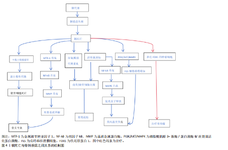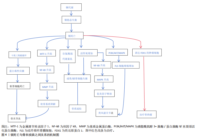 和激活,这些酶可降解软骨基质中胶原蛋白和蛋白多糖,最终导致软骨退变和关节损伤。铜死亡导致软骨损伤还与三羧酸循环相关,三羧酸循环不仅是细胞有氧呼吸过程中的关键环节,也是多种细胞代谢途径的交汇点,对于维持细胞的正常生理功能至关重要。铜死亡时,过量的铜离子直接与三羧酸循环中硫辛酰化蛋白乙酰转移酶和二氢硫幸酸琥珀酰基转移酶结合并诱导其寡聚化,在此过程中还会抑制铁硫簇蛋白的合成,影响线粒体电子传递链功能,进而影响细胞线粒体能量代谢,诱导蛋白毒性应激,最终导致软骨细胞死亡[4]。 除此之外,谷氨酰胺酶是谷氨酰胺代谢的关键酶,对于维持软骨细胞的和合成代谢和分解代谢至关重要。研究表明,在骨关节炎软骨细胞中谷氨酰胺的表达通常是下降的,在铜死亡过程中谷氨酰胺酶的表达受到抑制,谷氨酰胺代谢产物(如a酮戊二酸和谷胱甘肽)减少,导致软骨细胞合成代谢和分解代谢失衡以及抗氧化能力下降[28]。铜死亡过程会通过芬顿反应产生大量的活性氧导致氧化应激,损伤软骨细胞,同时,铜死亡诱导的氧化应激抑制谷胱甘肽还原酶和合成酶来加速谷胱甘肽的消耗并减少其合成,从而降低细胞内谷胱甘肽含量,影响软骨细胞抗氧化能力。总之,铜死亡通过多种机制促进软骨细胞损伤,最终导致骨关节炎的发生发展。 在骨关节炎的病理过程中,铜稳态失衡导致的软骨细胞死亡是关键环节,通过靶向调控这一过程为骨关节炎的治疗提供新的方向,例如,特异性铜螯合剂可有效降低滑液中异常升高的铜离子浓度,抑制金属调节转录因子1的的过度激活,从而减轻基质金属蛋白酶的表达,保护软骨细胞外基质免受降解;除此之外,还可在分子层面进行干预,通过靶向三羧酸循环中的酯酰化蛋白可以阻断铜离子诱导的蛋白毒性应激,使用铁氧还蛋白1抑制剂或是敲除铁氧还蛋白1可减轻软骨细胞线粒体功能障碍,维持细胞代谢稳态;针对氧化应激环节,开发铜死亡特异性抗氧化剂可有效与铜死亡过程中产生的活性氧中和,保护软骨细胞,延缓骨关节炎的发展。 2.4.2 骨质疏松 骨质疏松是一种以骨密度降低和骨微结构破坏为主要特征的代谢性骨病,与年龄相关,主要发生于老年人,尤其是绝经后的女性患者[29]。骨质疏松会导致骨骼脆性增加,使骨骼受到轻微外力时发生骨折[30-31],骨折部位常发生于髋部、脊椎、腕部及肩部[32]。骨质疏松早期临床表现不明显,被称为“沉默的疾病”,晚期可变现为疼痛、乏力和活动受限等,常见治疗方法包括抑制破骨细胞活性和诱导骨形成,药物治疗包括钙剂补充、维生素D、降钙素等[33-34],尽管这些药物可有效治疗骨质疏松,但仍存在局限性。铜离子作为人体内必须的微量元素与骨质疏松的发生相关[35],研究表明骨质疏松女性患者的血清铜低于健康人[36],铜的摄入量与骨密度呈正相关,与骨质疏松风险呈负相关[37]。 铜离子诱导的细胞死亡取决于细胞内铜的积累,会诱导一种独特的细胞死亡方式,骨质疏松的发生是由于骨髓微环境变化和成骨细胞与破骨细胞之间的稳态失衡[38-39],而铜死亡的相关代谢机制与这些细胞有关。例如,谷氨酰胺在成骨细胞能量代谢中不仅作为重要的代谢燃料,还通过多种机制支持细胞的增殖、分化和抗氧化能力,对骨骼的发育和维持至关重要[40-41],谷氨酰胺与铜死亡相关,在铜死亡过程中,谷氨酰胺酶活性受到抑制导致谷氨酰胺浓度降低,因此,成骨细胞能量代谢受到影响;此外,铜死亡诱导的氧化应激也在骨质疏松中起重要作用,氧化应激会抑制成骨细胞的增殖、分化和矿化能力,最终导致骨形成减少,高水平的活性氧可阻断成骨细胞分化过程,减少骨基质的合成。氧化应激除了影响成骨细胞之外,还可促进破骨细胞的分化和活性,活性氧通过激活核因子kB等信号通路促进破骨细胞生成,破坏骨吸收与骨形成的平衡,从而加剧骨质疏松的发展[42]。 骨质疏松的发生与铜稳态失衡密切相关,通过靶向铜死亡通路为骨质疏松的治疗提供新的思路。研究表明,铜螯合剂(例如青霉胺、四硫钼酸盐)可选择性清除病理状态下过量的铜离子,从而减轻成骨细胞的铜死亡,恢复成骨细胞的分化与矿化功能。同时,通过调控关键分子铁氧还蛋白1和金属调节转录因子1的表达改善线粒体功能、抑制氧化应激,从而保护成骨细胞并抑制破骨细胞过度活化。除铜螯合剂之外,铜离子载体(如伊利司莫)的精准投递系统也是一种潜在策略,通过纳米技术将铜离子运输至骨组织微环境,可在局部形成高浓度铜区域,从而诱导破骨细胞铜死亡,同时还能避免全身的铜毒性。 2.4.3 类风湿关节炎 类风湿性关节炎是一种慢性系统性自身免疫性疾病,主要累及关节,表现为关节滑膜的慢性炎症、增生和关节软骨及软骨的破坏以及血管翳形成[43-44],临床表现为关节僵硬、疼痛和畸形。类风湿关节炎的发病机制复杂多样,涉及遗传、环境、免疫系统异常激活及炎症相关因子的释放[45-47]。目前类风湿关节炎的治疗主要包括药物治疗、非药物治疗以及调整生活方式来缓解疾病的进展[48],但是,由于类风湿关节炎发病机制的复杂多样性,在治疗效果上仍然具有局限性,因此,阐明类风湿关节炎新的发病机制与治疗靶点,对类风湿关节炎的临床疗效有至关重要的意义。近年来的研究发现,铜死亡在类风湿关节炎的发病机制中起着至关重要的作用。 类风湿关节炎