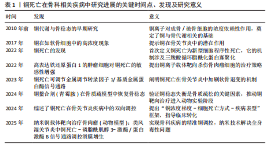 2.1 铜死亡在骨科相关疾病中研究进展的关键时间点、发现及研究意义 见表1。 2.2 骨与关节中的铜稳态 在骨组织中,铜对于调节骨稳态至关重要。铜离子对骨细胞的作用具有时间依赖性和浓度依赖性,不同浓度铜离子对骨细胞的增殖、分化和矿化等的影响存在显著差异。骨与关节中铜稳态的维持对于促进骨骼发育并维持骨骼和软骨稳态至关重要[6],该部分内容旨在探讨铜离子对骨与关节组织内各种细胞成分的调节作用。 2.2.1 软骨细胞 研究表明,在生理情况下,软骨细胞中的铜离子高于其他组织[7],突出了铜离子在软骨细胞代谢中的重要作用。研究表明,铜离子能够在一定浓度范围内促进软骨细胞的增殖和分化,增强软骨基质的合成[8];通过上调软骨细胞特异性基因的表达(如SRY框"
