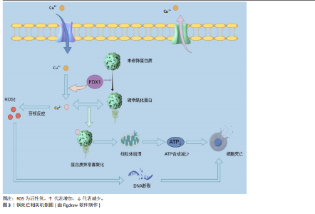 转录因子、聚集蛋白聚糖和Ⅱ型胶原蛋白)促进软骨细胞的成熟。铜离子还可以促进软骨形成调节蛋白(包括胰岛素样生长因子1、胰岛素样生长因子结合蛋白3和碱性磷酸酶)的分泌来促进软骨细胞增殖和软骨修复。最佳浓度铜离子可增强骨髓来源的间充质干细胞向软骨细胞的分化[9],通过增强赖氨酸氧化酶活性和胶原蛋白交联酶活性来促进软骨内的胶原蛋白交联,从而维持关节软骨生物力学特性和软骨强度。生理浓度的铜离子还抵消了与骨分解代谢相关标志物的上调,这对于维持软骨完整性至关重要。基于铜离子对软骨细胞的正面影响,凸显了它在治疗骨关节炎方面的巨大潜力。 2.2.2 成骨细胞 从成骨的角度看,铜离子通过上调骨相关基因(如碱性磷酸酶和骨桥蛋白)及下游基因表达有助于骨矿化[10]。不同浓度铜离子对成骨细胞矿化功能的影响不同,低浓度铜离子可以促进成骨细胞的矿化功能,而高浓度铜离子可能抑制成骨细胞的矿化功能,导致细胞毒性[5]。铜离子在一定浓度范围内可促进成骨细胞的增殖与分化、诱导血管内皮生长因子生成,血管内皮生长因子增加内皮细胞中骨形态发生蛋白2的表达,促进成骨的分化与矿化。研究表明,最佳浓度铜离子可上调Wnt/β-catain信号通路的关键成分(如轴抑制蛋白2、糖原合成激酶3等)来增强成骨生物活性,刺激成骨细胞的增殖与活性,这在增强骨形成方面起关键作用[11]。铜离子可通过干预成骨分化过程促进成骨分化。在成骨分化的过程中,骨髓间充质干细胞倾向于进行有氧糖酵解并将葡萄糖代谢为乳酸,有氧糖酵解中重要的调节因子是缺氧诱导因子1α-葡萄糖转运蛋白1型信号通路,而敲低缺氧诱导因子1α可抑制成骨分化[11]。研究表明,铜离子作为糖酵解代谢必须的微量元素,可通过激活缺氧诱导因子1α-葡萄糖转运蛋白1型信号通路刺激糖酵解,促骨髓间充质干细胞向成骨细胞分化[12]。 2.2.3 破骨细胞 铜离子对破骨细胞的作用具有双向性,可促进破骨细胞的分化与骨吸收活性,也能在特定条件下抑制破骨细胞功能,具体作用取决于铜离子的浓度、微环境等因素[13]。局部低活性氧是破骨细胞分化的必要条件[14],低浓度铜离子(1-10 μmol/L)通过活性氧/活化T细胞核因子胞质1轴增强破骨细胞分化和活化,促进骨吸收。高浓度铜离子(> 50 μmol/L)可通过诱导铜死亡促使破骨细胞凋亡,减少破骨细胞细胞数量。铜作为酶辅助因子,可通过影响酶的活性调节破骨细胞的活性和吸收,也可通过影响炎症因子影响破骨细胞。例如,白细胞介素6具有明显促进破骨细胞分化的功能,铜改性钴铬颗粒能够下调炎症因子肿瘤坏死因子α、白细胞介素6表达降低核因子κB受体配体激活剂和破骨细胞相关特异性转录标志基因的表达[15],从而抑制破骨细胞的分化。因此,靶向铜死亡有望成为治疗骨质疏松的新治疗策略。 2.2.4 滑膜细胞 在滑膜细胞中,铜稳态的维持对于滑膜细胞的代谢至关重要。铜作为多种酶的辅因子,参与细胞代谢过程,如线粒体呼吸链中的细胞色素需要铜的参与将能量从细胞分子中释放出来,为滑膜细胞提供动力。铜离子具有抗菌活性,能够增强巨噬细胞的吞噬能力,提高机体的抗感染能力[16],有助于滑膜细胞在炎症环境中的生存和修复。除此之外,铜离子还参与抗氧化防御机制,如超氧化物歧化酶活性就依赖于铜离子的存在,可帮助清除体内的自由基[17],从而保护滑膜细胞免受氧化应激的损害。 2.3 铜死亡 铜死亡是由细胞内铜离子过量所致的细胞死亡模式,该死亡机制复杂多样,与三羧酸循环与氧化应激密切相关。三羧酸循环是糖、脂肪以及氨基酸代谢的枢纽,是细胞代谢的重要环节,因此,细胞内的铜稳态对于维持细胞正常功能至关重要。铜离子的摄入增多和排出减少都会导致细胞内铜离子过量,过量的铜离子与三羧酸循环中的硫幸酰化蛋白质相结合并诱导其寡聚化[18],导致蛋白毒性应激,最终导致细胞死亡(图3)。研究表明,铁氧还蛋白1是介导铜死亡的关键因子,它不仅可以将一价铜还原为更具有毒性的二价铜,还是蛋白硫幸酰化的上游调节因子。蛋白硫幸酰化是一种赖氨酸翻译后修饰,目前已知的蛋白质硫幸酰化仅发生在4种酶上,分别是二氢硫辛酰胺支链转酰酶E2、甘氨酸裂解系统蛋白H、二氢硫辛酰胺S-琥珀酰转移酶以及二氢硫辛酰胺S-乙酰转移酶,这4种酶都是三羧酸循环中丙酮酸脱氢酶复合体的重要组成部分。铁氧还蛋白1促进蛋白质硫幸酰化,铜离子结合硫幸酰化蛋白质并增强其寡聚化,从而使线粒体膜电位崩溃以及ATP生成减少,诱导细胞膜破裂、细胞死亡。氧化应激是指细胞或生物体内氧化物质过度产生或是消除能力减弱导致体内氧化和抗氧化作用失衡的一种状态,倾向于氧化。铜离子可通过芬顿反应增加活性氧的产生,并激活与氧化应激相关的信号通路,损伤DNA,干扰线粒体功能以及破坏细胞膜完整性,从而达到杀伤细胞的目的。 研究表明,尽管铜死亡与铁死亡的模式不相同,但是两者之间有一定相关性,两者均通过活性氧积累并涉及线粒体通透性转换孔的激活从而触发细胞损伤[19]。“铁死亡”这一概念是2012年提出的,是一种铁依赖性的、脂质过氧化驱动的程序性细胞死亡方式[20]。研究表明,双硫仑/铜复合物可加速游离铁积累和脂质过氧化来促进铁死亡[21],过量的铜离子可通过谷胱甘肽/GPH4/TAX1BP1轴导致脂质过氧化,增强