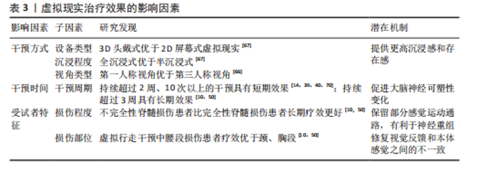 时通过虚拟现实可以实现视觉、触觉的同步输入,二者输入的协调性有助于提高身体所有权感[53]。研究显示,更强的身体所有权感与疼痛减轻密切相关[40]。 HOFFMAN等[54]在一项随机交叉试验中发现,添加触觉反馈可以帮助虚拟现实更有效地减轻疼痛,同时也增加了化身的具体化,最后预测了触觉反馈联合虚拟现实在慢性疼痛中的应用,指出这项应用可能在未来的研究中提高治疗慢性疼痛的有效性。POZEG等[40]成功将虚拟现实应用于脊髓损伤后神经病理性疼痛患者中,具体结果见表2。 2.4.3 虚拟现实联合本体感觉刺激 虚拟现实联合本体感觉刺激与虚拟行走具备相似的潜在机制,都有助于增强视觉反馈和本体感觉之间的一致性,增强感觉运动皮质兴奋性,调节大脑可塑性[55],从而缓解疼痛。肌腱振动是一种常用的本体感觉刺激方式,通过诱导肌腱伸长,诱发无痛运动感知[56],即当股四头肌受到振动时,在无实际运动的情况下会产生膝关节屈曲的运动感知,此时给予与动作感知相应的视觉反馈,有助于增强感觉运动区域的募集,增强大脑可塑性调节。 SABALETTE等[42]研究显示,虚拟行走与步态式肌腱振动的组合干预在缓解脊髓损伤后神经病理性疼痛方面效果显著,如表2所示。先前类似的干预手段多用于神经损伤患者的运动功能恢复方面[55],而这项研究则证实了此方案在疼痛治疗领域的潜力。 2.4.4 虚拟现实联合运动疗法 虚拟现实联合运动治疗能有效抑制炎症因子释放、恢复大脑皮质灰质体积,同时还能提高患者训练的积极性,既能减轻疼痛又能改善运动障碍。运动疗法虽能缓解疼痛[57],但传统重复训练的枯燥感容易降低患者的依从性,进而影响治疗效果。虚拟现实能提供游戏化设计同时还能根据不同患者进行个性化调整。将虚拟现实与运动训练联合,提高了训练的趣味性,提升了患者训练的积极性,有利于增强治疗效果。除此之外,虚拟现实运动训练还可促使双侧感觉运动皮质和海马灰质体积增加[58],这一变化对大脑的异常可塑性起到了调节作用。近期研究还证实了虚拟现实运动干预在炎症因子调控方面的作用,干预后肿瘤坏死因子、白细胞介素6水平明显下降,白细胞介素2和白细胞介素4水平则有所升高[59],见图4。 虚拟现实联合运动疗法的应用基于运动功能障碍与神经性疼痛共有的皮质机制[50],在调节与疼痛相关的体感皮质的同时还能激活参与运动的皮质区域,既能减轻疼痛又能改善运动障碍,如表2所示。 除上述联合方式外,虚拟现实与正念冥想、催眠、呼吸以及放松疗法的联合干预在慢性疼痛管理中同样显示出较大优势[16,60-62],但尚缺少在脊髓损伤后神经病理性疼痛中的应用。疼痛是一种复杂的、多因素的主观体验,包括感觉辨别、情感动机和认知评估成分,MELZACK[29]提出“疼痛矩阵”的概念,与疼痛相关的大脑区域形成一个相互联系的网络,会共同编码疼痛的感觉和情感体验,情感成分在疼痛处理中同样至关重要。然而当前尚缺乏针对脊髓损伤后神经病理性疼痛患者疼痛情感维度的系统性虚拟现实干预策略,例如虚拟现实与正念、冥想的联合。初步证据表明,正念冥想可诱导前额叶皮质等情感调节区域的可塑性变化,增加灰质体积及皮质厚度[63],这有望逆转脊髓损伤导致的神经结构损害,提高疼痛的情感调节,帮助缓解疼痛。但正念冥想训练也存在一个主要问题,即难以长时间集中注意力,尤其是对于初学者来说,主要因为这是一个主观的内感受过程。因此,迫切需要一种有形的方法,能够提供身临其境的感官引导,以促进精神控制,虚拟现实的发展就提供了很好的辅助选择。虚拟现实催眠与虚拟现实呼吸同样属于较新的干预形式。催眠主要与转移注意力相关,催眠通过诱导解离状态来改变疼痛刺激的处理,帮助受试者将注意力从伤害性输入上转移开,从而缓解疼痛[64]。不同受试者解离和对催眠做出反应的能力以及从催眠镇痛中受益的能力存在很大差异。然而有研究显示,在催眠中添加虚拟现实可以减轻大量个体的疼痛,即使是催眠水平较低的受试者[65],这可能是由于它增强了注意力集中并提供了视觉刺激。虚拟现实呼吸训练诱发了沉浸式 3D外感受过程,增强了视觉听觉皮质的激活,帮助大脑将更多的资源分配给视觉或听觉任务,减少了初级体感皮质的疼痛处理功能,同样能够有效缓解疼痛[61]。一项最新研究还显示出虚拟现实引导下的放松疗法对疼痛强度和焦虑情绪的显著改善,该技术有利于将注意力转移到大脑上进而影响身体的自主神经平衡,通过调节交感神经和副交感神经系统,引导放松和疼痛减轻[62]。未来可积极探索虚拟现实与正念冥想、催眠、呼吸以及放松疗法联合干预在脊髓损伤后神经病理性疼痛中的应用效能。 2.5 虚拟现实治疗效果的影响因素分析 大部分研究显示出虚拟现实干预缓解脊髓损伤患者神经性疼痛的有效性,但也存在一些相互矛盾的结果,这可能与干预方式(干预设备、干预视角)、干预时间、受试者损伤程度相关。 (1)干预方式:存在感与沉浸感是虚拟现实治疗效果的关键因素,更高程度的沉浸感及存在感与更好的疼痛缓解效果直接相关[41]。干预设备以及干预视角的不同是影响二者的重要因素[66-67],3D设备、第一视角的干预往往会带来更强的沉浸感,增强治疗效果。AUSTIN等[67]在一项随机对照研究中比较了3D头戴式以及2D屏幕式虚拟现实