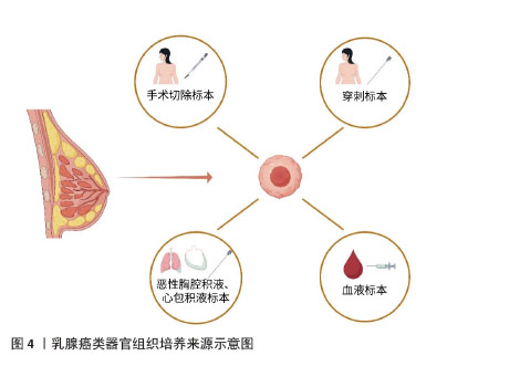 2.1 乳腺癌研究模型的创新 以往乳腺癌的研究通常依赖已构建的细胞系来探究相关药物的作用以及细胞内相关信号通路的传递与表达。虽然已有的细胞系也涵盖了目前大部分乳腺癌的各个分子分型,包括三阴性的MDA-MB-231、A549、激素受体阳性的MCF-7细胞系等,它们在一定程度上体现了肿瘤的异质性,但是围绕细胞系的探索始终不能体现肿瘤微环境、不同细胞之间的通讯等因素对肿瘤细胞带来的影响。此外,还有一种实验模型是将患者来源的肿瘤组织移植到免疫缺陷的小鼠上建立的,虽然可以在一定程度上维持肿瘤细胞的遗传特性,但其个体差异的存在以及构建的高成本仍使得相关的研究成果难以应用于临床实践。 乳腺癌类器官是一种模拟了与乳腺癌组织有类似空间结构、具有相似功能的三维立体结构,是由相应干细胞或对应的癌变组织在特定的培养条件下发展而来。它不仅可以模拟肿瘤微环境、展现细胞间的交流互动,并且构建成功后生长速度快,保持肿瘤较高还原度的临床特征。CHEN等[13]从耐药的乳腺癌患者中获得肿瘤组织并培养成类器官模型,他们发现该类器官模型可以很好地还原患者对于某种药物的临床反应,并且准确地体现了肿瘤组织的组织病理学和遗传学特征。此外,乳腺癌类器官相对的高经济性使得它成为筛选药物敏感性的实用模型之一。 现有的乳腺癌类器官培养,通常是先将患者的肿瘤组织用胰酶消化成单个或成团的肿瘤细胞,然后种植于基底膜提取物中,加入含有多种生长因子的特定培养基,在特殊的培养条件下构建而成。乳腺癌类器官的组织来源种类众多,包括手术或穿刺标本、恶性胸腔积液等,共培养的免疫细胞也可能来源于血液标本等,见图4[12,14]。传统的类器官培养往往会受到患者来源肿瘤组织的批次间差异以及细胞外基质稳定性的影响,面临可重复性低、失败风险高等困难。探索新型的标准化内容以及稳定的类器官培养体系将是未来类器官培养领域的热点。AREF等[15]运用3D微流控系统,通过不同大小的过滤器获得分别为S1(> 100 μm)、S2(40–100 μm)和 S3(< 40 μm)3个肿瘤成分,而后收集富含S2组分的肿瘤组织与胶原蛋白混合,加入到微流控系统中。这种培养方法可以保留天然的淋巴细胞和骨髓细胞,模拟复杂的肿瘤微环境[15]。此外,HERNANDEZ-GORDILLO带领团队[16]将聚乙二醇水凝胶与基质金属蛋白酶可降解肽交联,并结合α2β1整合素结合肽,它们的组合对类器官培养与生长的支持完全可以与基质胶媲美甚至超越。创新的共培养方式有助于更好地模拟体内肿瘤生长微环境,研究细胞间的相互作用及其对肿瘤生长、侵袭和治疗反应的影响。 综上,乳腺癌类器官作为乳腺癌研究方面的新模型,其原始肿瘤细胞来源的多样性,培养体系的不断创新,使得它越来越成为乳腺癌研究领域最具潜力的工具之一,同时其对药物敏感性筛选的有效性也让它改善临床上乳腺癌患者治疗耐药成为可能。 "