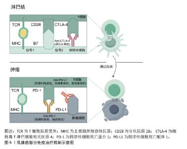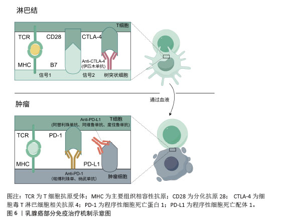 2.2.3 免疫治疗药物 免疫治疗是在癌症治疗领域新兴的治疗手段,有望在癌症治疗上取得突破性进展。与其他癌症免疫治疗类似,程序性细胞死亡蛋白1与程序性细胞死亡配体1的单克隆抗体也是乳腺癌免疫治疗的主要治疗药物之一[44],见图6。然而免疫治疗在目前的乳腺癌治疗临床实践中获得的收益有限,这可能与诱导有效的免疫细胞难度较大有关,后续寻找更有效的免疫治疗标志物可能是预测免疫治疗疗效的手段之一。传统的细胞实验往往难以模拟肿瘤免疫微环境,而动物实验模型往往与人类的免疫系统相比,存在较大差异,两者均难以真正评估免疫治疗在乳腺癌中的疗效,类器官技术较高程度地还原了肿瘤微环境,包括免疫微环境,在乳腺癌免疫治疗过程中发挥的作用。类器官技术为探究免疫治疗药物在乳腺癌治疗中的敏感性以及后续相关药物的开发与应用于临床提供了重要保障[45]。 "
