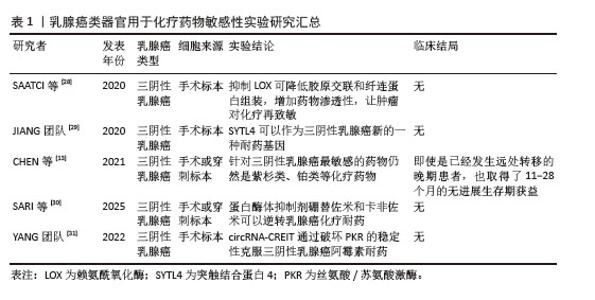 2.2 乳腺癌类器官基于精准医疗背景下的药物筛选 目前乳腺癌的精准治疗主要基于其肿瘤的分子分型、生物标志物以及个体化差异,为患者制定个性化的治疗方案。一般将乳腺癌分为HER2阳性型、激素受体阳性型以及三阴性乳腺癌(triple negative breast cancer,TNBC)[17]。针对HER2阳性型乳腺癌,通常使用曲妥珠单抗/帕妥珠单抗靶向HER2有效治疗这类患者。针对雌激素受体阳性型(HR+)患者,内分泌治疗常用于治疗该类患者,包括芳香化酶抑制剂、雌激素受体调节剂等。目前针对高复发风险的HR+型乳腺癌患者,CDK4/6抑制剂(如瑞博西利、阿贝西利和达拉西利)联合内分泌治疗在改善此类患者的无病生存期取得了令人惊喜的效果[18-19]。三阴性乳腺癌目前尚无针对性的治疗策略,化疗往往是临床上采取的相对有效的治疗方法,但是三阴性乳腺癌对化疗的敏感性也因人而异,这也导致患者的预后相对较差[20]。学者们为提高三阴性乳腺癌的疗效做出了巨大的努力,上海复旦大学附属肿瘤医院邵志敏教授团队基于三阴性乳腺癌基因组与转录组景观,提出了三阴性乳腺癌的“复旦分型”,针对不同的亚型,也提出了不同的针对性治疗策略[21]。免疫治疗,特别是针对程序性细胞死亡蛋白1/程序性细胞死亡配体1的治疗,目前在三阴性乳腺癌中取得了一定的疗效。在KEYNOTE-522试验中,帕博利珠单抗联合新辅助化疗显著提高了病理完全缓解率(64.8% vs. 51.2%),并延长了无事件生存期[22]。但无论是化疗,亦或者是免疫治疗,许多患者往往因无法耐受药物副反应而中止治疗,导致三阴性乳腺癌类型乳腺癌患者5年生存率仍然偏低。 如何选择针对肿瘤异质性如此显著的乳腺癌患者治疗药物,以及判断相关药物的治疗毒性,仍旧是目前乳腺癌治疗领域等待突破的关键问题之一。类器官作为一种高效的药物敏感性筛选模型能在很大程度上改变这种局面,其生物学信息的高保真性、与其亲本肿瘤高度一致的药物反应性,进一步指导临床药物使用,更好地推动对乳腺癌的精准治疗。CHEN团队[13]从99个样本中建立了132个乳腺癌类器官模型,总体成功率为75%,随后使用这些模型进行药物敏感性测试,最后的结果显示从类器官模型上获得的药物反应在很大程度上反映原发性肿瘤的反应。WU等[23]建立的70余例乳腺癌类器官模型检测药物疗效也取得了近似的结果,为后续乳腺癌的精准治疗提供了依据。此外,可以从药物筛选单独角度出发,利用类器官技术观察类器官培养上清液中循环肿瘤DNA(ctDNA)变异等位基因频率的动态变化并且联合药敏性实验多维度指导治疗策略[24]。 2.2.1 化疗药物 化疗是目前乳腺癌治疗的常用手段,尤其是针对三阴性乳腺癌,化疗是其治疗策略的核心[25]。乳腺癌化疗通常有蒽环类、紫杉类以及铂类药物,各类化疗药物往往引起各不相同的副反应,比如说蒽环类药物不可逆的心脏毒性,以及紫杉类药物的神经毒性等等,都在很大程度上威胁患者的身心健康,影响患者的生活质量,导致患者依从性差。如何精准筛选药敏性强的化疗药物,在保证杀伤效果的同时,尽可能减低化疗的毒副反应,是目前制定化疗策略的关键。基于类器官检测药物敏感性的结果,修正具体的临床用药,选择最适合患者的化疗方案,获得临床最大收益。同时,使用类器官这个工具也可以评估化疗联合其他药物作用于不同类型乳腺癌的获益。 针对三阴性乳腺癌患者,虽然化疗是目前相对有效的治疗手段,但达到病理完全缓解的三阴性乳腺癌患者仍然只有30%-40%,这与三阴性乳腺癌的肿瘤特性所导致的化疗耐药密切相关[26]。学者们利用类器官寻找针对三阴性乳腺癌高药敏性的化疗药物,亦或是基于类器官寻找化疗联合其他药物的三阴性乳腺癌治疗策略仍然是目前研究的热点[27]。SAATCI等[28]发现在阿霉素耐药的三阴性乳腺癌类器官中,LOX抑制剂与阿霉素的组合显著减小了类器官大小,抑制LOX可降低胶原交联和纤连蛋白组装,增加药物渗透性,并下调ITGA5/FN1表达,导致抑制FAK/Src信号传导,诱导细胞凋亡和对化疗的再致敏。JIANG团队[29]用患者来源三阴性乳腺癌类器官模型鉴定了SYTL4可以作为三阴性乳腺癌新的一种耐药基因。在CHEN等[13]的研究中,他们建立了13例类器官样本,其中包括8例三阴性乳腺癌,应用类器官进行药敏实验发现针对三阴性乳腺癌最敏感的药物仍然是紫杉类、铂类等化疗药物,将药敏实验结果应用于临床实践,同样也获得了与预期一样不错的疗效,即使是已经发生远处转移的晚期患者,也取得了11-28个月的无进展生存期的获益。利用乳腺癌类器官检测化疗药物敏感性的相关文献结论总结如表1所示。 "