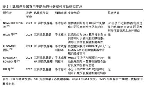 传统的乳腺癌靶向治疗主要在HER2阳性型乳腺癌患者中开展,而HER2阳性在总的乳腺癌患者中约占20%,相当大的一部分患者可以在针对HER2的靶向治疗中获益[32]。针对HER2的靶向药物种类也在不停地更新换代,从刚起步时曲妥珠、帕妥珠单抗的应用,到现在针对转移性的HER2阳性乳腺癌患者仍有T-DM1应用于靶向HER2治疗,为此类乳腺癌患者带来了福音。除了针对HER2的靶向治疗,核糖聚合酶(PARP)、细胞周期蛋白依赖性激酶(CDK4/6)、成纤维细胞生长因子受体等也是公认的治疗靶点,一直是乳腺癌靶向治疗药物开发的主要重点[11,33]。 类器官模型是目前相对有效、使用较多且准确率较高的验证靶向药物疗效的工具。NAVARRO-YEPES等[34]使用类器官模型研究两种CDK4/6抑制剂在激素受体阳性乳腺癌中的有效性,得出一个有趣的结论,对帕博西利耐药的激素受体阳性乳腺癌仍可对阿贝西利敏感;细胞周期蛋白E、白细胞介素6/JAK/STAT3和自噬途径的上调都与帕博西利耐药有关[35-36]。然而由于阿贝西利的多激酶抑制活性使得对帕博西利耐药的激素受体阳性乳腺癌类器官及PDX模型仍对阿贝西利有反应,且其疗效在临床患者的用药实践中得到了验证[36]。同时有研究利用类器官模型验证得出结论,表皮生长因子受体和HER2通路的表达上调可能与ER+的乳腺癌对CDK4/6抑制剂的耐药相关[37]。此外,还有一篇类器官的研究中报道了他汀类药物与AKT靶向药物联用的协同作用可以诱导PDO模型中体外三阴性乳腺癌的细胞毒性,为三阴性乳腺癌靶向治疗提供了新的治疗策略[38]。在SHAO教授团队[39]的研究中,类器官技术被充分应用于乳腺癌药敏筛选领域,他通过对HER2阳性型的乳腺癌患者进行多组学分析,根据其分子特征,将HER2阳性型乳腺癌分为4类,经典HER2(HER2-CLA)亚型、免疫调节(HER2-IM)亚型、管腔样(HER2-LUM)亚型和基底/间充质样(HER2-BM)亚型。SHAO教授团队获取并建立多个乳腺癌患者组织来源的肿瘤类器官,验证了肿瘤异质性的存在以及其对不同药物敏感性的特点,比如说管腔样(HER2-LUM)亚型的HER2阳性乳腺癌与激素受体阳性型乳腺癌的分子分型类似,在类器官验证的基础上,他们得出结论,内分泌治疗对该类型HER2阳性乳腺癌患者有效。总的来说,类器官在靶向药物在乳腺癌中的疗效验证中发挥了重要作用[40],对不同类型的乳腺癌患者个性化药物选择提供了新的策略,同时也为类器官技术在乳腺癌治疗领域带来了更广泛、更实用的应用。利用乳腺癌类器官检测靶向药物敏感性的相关文献结论总结如表2所示。 "