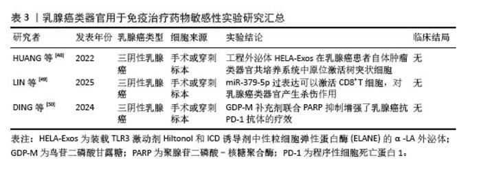 截至目前,三阴性乳腺癌仍缺乏针对性的治疗方案,其中位生存期仍然较短,免疫治疗的兴起为三阴性乳腺癌的精准治疗提供了新的策略。DIVOUX等[46]使用患者肿瘤来源类器官评估三阴性乳腺癌对免疫治疗的疗效。 JIANG教授团队[47]发现鸟苷二磷酸-甘露糖是一种重要的高同源重组修复缺陷相关代谢物,并提出了一种有前途的治疗策略,使用鸟苷二磷酸-甘露糖、PARP抑制剂和抗程序性细胞死亡蛋白1免疫疗法的组合来治疗低同源重组修复缺陷评分三阴性乳腺癌,并且该治疗方案在患者类器官模型中取得了不错的疗效。此外,XU等[44]使用类器官模型验证葫芦素通过激活cGAS-STING 先天免疫途径,与程序性细胞死亡蛋白1阻断剂的联合给药显现出显著的协同功效。 使用类器官模型探索免疫治疗在乳腺癌治疗中的疗效,无论是其相关的机制研究,亦或是其它药物与免疫检查点单克隆抗体联用的疗效,均取得了一定的成效。发现更多的免疫标志物,亦或是多种药物联用,或许可以是未来乳腺癌精准治疗的发展与研究方向之一。利用乳腺癌类器官检测免疫治疗药物敏感性的相关文献结论总结如表3所示。 "