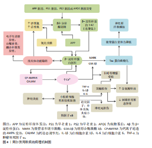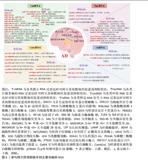 与稳健性,也有助于更全面了解其在阿尔茨海默病多因素、多通路互作的病因机制。 2.2.1 微小RNA与阿尔茨海默病 微小RNA是一类内源性短链非编码RNA,可通过靶向结合mRNA的3’-UTR介导mRNA降解或翻译抑制,从而在转录后水平调控基因表达。其表达水平受到严格调控,并可灵敏响应细胞内外环境变化[25]。在阿尔茨海默病患者中,血液和脑脊液内的微小RNA呈现特异性表达变化,因此具备作为疾病诊断生物标志物的潜力;同时因其固有的多靶点属性使微小RNA能直接或间接影响多个阿尔茨海默病关键基因表达,进而参与多种病理过程的调控。 (1)调控β-淀粉样蛋白代谢和Tau蛋白磷酸化:微小RNA失调与调节β-淀粉样蛋白生成、切割、清除及Tau蛋白磷酸化的关键基因有关。在多种阿尔茨海默病模型中,miR-149、miR-34a-5p和miR-12b-5p、miR-29c-3p、miR-340表达均下调[26-29],并与β位淀粉样前体蛋白裂解酶1水平呈负相关;其过表达可靶向抑制β位淀粉样前体蛋白裂解酶1表达,减少β-淀粉样蛋白沉积。而阿尔茨海默病模型小鼠中miR-331-3p和miR-9-5p的表达呈现明显的病程依赖性动态变化[30]:在疾病早期,两者下调可解除对自噬受体蛋白sequestosome 1 (p62/SQSTM1)和Optineurin(OPTN)的抑制,从而增强自噬活性促进β-淀粉样蛋白清除,发挥神经保护作用;而在晚期,两者表达上调则过度抑制自噬,导致自噬能力受损引发β-淀粉样蛋白堆积。因此抑制两者表达可增强自噬流、促进β-淀粉样蛋白清除能力并改善认知功能,提示其具有作为分期治疗靶点的潜力。此外,miR-539-5p在APP/PS1小鼠模型中下调并与淀粉样前体蛋白水平呈负相关,恢复其表达可通过激活磷脂酰肌醇3激酶/蛋白激酶通路抑制糖原合酶激酶3β活性,从而减少β-淀粉样蛋白生成、抑制Tau蛋白过度磷酸化并改善学习记忆功能障碍,表明miR-539-5p-磷脂酰肌醇3激酶/蛋白激酶B/糖原合酶激酶3β轴可能是阿尔茨海默病的潜在治疗靶点[31]。有研究发现,在早期阿尔茨海默病患者血浆中,miR-483-5p表达量增加最为显著,并在mRNA和蛋白质水平上抑制细胞外信号调节激酶1/2,降低其磷酸化活性,进而减少Tau磷酸化阻碍神经原纤维缠结的形成[32]。另有研究发现在APP/PS1小鼠模型中,miR-148a-3p表达下调解除了对p35和磷酸酶张力蛋白同源物的抑制,进而分别过度激活细胞周期蛋白依赖激酶5和蛋白激酶B信号通路,共同促使Tau蛋白过度磷酸化。尤为重要的是,环磷酸腺苷反应元件结合蛋白作为磷酸酶张力蛋白同源物/蛋白激酶B下游效应子被激活后,能直接结合miR-148a-3p启动子并促进其表达,形成一个自调节的前馈循环以挽救认知障碍和Tau病理学[33]。 (2)调节炎症反应和氧化应激:核因子κB信号通路激活是驱动神经炎症的核心枢纽[34]。在阿尔茨海默病中下调的miR-22-3p和miR-216a-5p分别丧失对靶基因性别决定区Y框蛋白9和高迁移率族蛋白1的抑制作用[35-36],导致二者表达升高并直接激活核因子κB通路;同时,上调的miR-25802通过直接结合Krüppel样因子4 mRNA负向调节Krüppel样因子4,进一步促进核因子κB介导的炎症反应来推动小胶质细胞向促炎M1表型极化[37]。可见这3种微小RNA可通过不同机制共同增强核因子κB信号通路的活性,放大神经炎症反应,从而加剧阿尔茨海默病的病理损伤及认知功能障碍。此外有研究发现,抑制miR-10b-5p可解除其对靶基因同源盒基因D10的转录抑制,上调同源盒基因D10表达,从而进一步抑制Ras同源基因(Ras homolog gene,Rho)/Rho相关卷曲螺旋形成蛋白激酶信号通路,最终显著降低白细胞介素1β、白细胞介素6、肿瘤坏死因子α和丙二醛表达水平,并提高超氧化物歧化酶活性[38]。证实miR-10b-5p/同源盒基因D10/Ras同源基因/Rho相关卷曲螺旋形成蛋白激酶轴可通过同步抑制炎症与氧化应激,在阿尔茨海默病中发挥协同神经保护作用。HU等[39]研究表明,miR-107-5p过表达可直接靶向并抑制Toll样受体4表达,从而阻止核因子κB p65的核转位,进一步降低活性氧、肿瘤坏死因子α、白细胞介素1β、白细胞介素6和髓系细胞触发受体 2水平,并减弱小胶质细胞异常激活,最终有效减轻氧化应激和异常炎症反应,在阿尔茨海默病中发挥神经保护作用。 (3)靶向突触可塑性和钙稳态:维持和调节突触结构与功能的多种因素,包括神经递质、蛋白质及信号通路等,均受到多种微小RNA的调控。其中miR-181a作为α-氨基-3-羟基-5-甲基-4-异恶唑丙酸(alpha-amino-3- hydroxy-5-methyl-4-isoxazolepropionic acid,AMPA)受体的关键负调控因子,通过直接结合离子型谷氨酸受体AMPA型亚基1(glutamate ionotropic receptor AMPA type subunit 1,GluA1)和离子型谷氨酸受体AMPA型亚基2(glutamate ionotropic receptor AMPA type subunit 2,GluA2)亚基的mRNA,抑制其翻译并促进降解,从而显著降低海马中受体的表达水平,损害突触可塑性导致记忆形成与巩固障碍;相反抑制miR-181a表达则可有效逆转上述效应,改善记忆缺陷[40]。有研究发现,miR-431过表达可通过特异性结合Smad4 mRNA的3’-UTR区域并抑制其翻译,显著降低Smad4蛋白水平[41]。该作用直接促进突触素1、突触后致密蛋白95、N-甲基-D-天冬氨酸受体1、N-甲基-D-天冬氨酸受体2A和N-甲基-D-天冬氨酸2B受体等分子表达,并增强长时程增强效应;同时亦可间接恢复Dlg3基因表达,从而在突触前与突触后层面双向协同提升突触稳定性,最终逆转突触可塑性损伤并改善记忆功能。ZOU等[42]研究发现在携带突变早老素1的阿尔茨海默病小鼠模型中,皮质内特异性降低的miR-339-