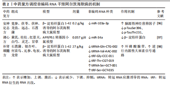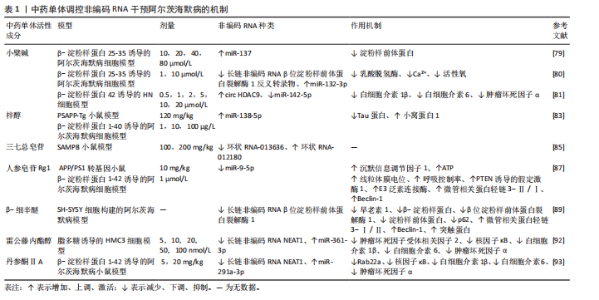 白诱导的阿尔茨海默病模型中,小檗碱可通过调节多种非编码RNA发挥神经保护作用。具体而言,在β-淀粉样蛋白25-35诱导的模型中,小檗碱干预后显著上调细胞内miR-137表达,从而降低淀粉样前体蛋白水平[79];亦可下调长链非编码RNA β位淀粉样前体蛋白裂解酶1反义转录物表达,解除对miR-132-3p的抑制,进而降低乳酸脱氢酶活性、Ca2+浓度和活性氧水平,且高浓度小檗碱作用尤为显著[80]。然而在β-淀粉样蛋白42诱导的HN细胞模型中,小檗碱则通过增加circ HDAC9表达并抑制miR-142-5p,减少促炎因子白细胞介素1β、白细胞介素6和肿瘤坏死因子α产生[81]。综合以上效应可见,黄连清热化痰、解毒通络、泻火护神的传统药效,为从“解毒祛痰”调控不同非编码RNA论治阿尔茨海默病提供了分子依据。 (2)梓醇:梓醇(CAT)是从中药地黄中提取的主要小分子环烯醚萜类化合物,现代药理学发现其具有抗衰老、抗炎、增强免疫及神经系统保护作用[82]。MENG等[83]研究中发现,梓醇在体内外均能延缓阿尔茨海默病进展,其主要机制是通过上调miR-138-5p表达,一方面抑制Tau蛋白异常沉积,另一方面促进小窝蛋白1表达,从而增强突触可塑性、维持神经元完整性。可见梓醇从分子层面揭示了其通过调控微小RNA以“补肾填髓”法论治阿尔茨海默病的作用机制(3)三七总皂苷:三七总皂苷(PNS)是中药三七的主要活性成分,具有抗炎、抗氧化、抗血小板聚集和神经保护等多种药理作用[84]。HUANG等[85]研究表明,在SAMP8小鼠模型中,三七总皂苷可显著调控海马组织中环状RNA表达谱,尤其下调环状RNA-013636并上调环状RNA-012180的表达,且这两种环状RNA均参与阿尔茨海默病相关信号通路。该结果表明,三七总皂苷可能通过调节环状RNA表达以抑制阿尔茨海默病病理进展,而结合其“散瘀止血、消肿定痛”之功效,未来研究可侧重于深入解析其通过环状RNA调控Tau蛋白磷酸化及神经纤维缠结降解的具体分子机制。 (4)人参皂苷Rg1:人参皂苷Rg1是人参总皂苷中活性最强的单体成分,具有天然抗氧化、抗衰老及抗凋亡等药理活性[86]。近期体内外研究表明,其可通过靶向下调miR-9-5p,解除对沉默信息调节因子1的抑制,进而提升ATP水平、线粒体膜电位及呼吸控制率;并增强PTEN诱导的假定激酶1、E3泛素连接酶、微管相关蛋白轻链3-Ⅱ/Ⅰ、和Beclin-1等自噬相关蛋白表达,最终显著改善阿尔茨海默病中线粒体功能障碍,延缓疾病进展[87]。此次研究阐明了“益气充髓”法通过调控miR-9-5p/沉默信息调节因子1/线粒体自噬轴治疗阿尔茨海默病,为该治法的现代科学内涵提供了实验依据。 (5) β-细辛醚:β-细辛醚是石菖蒲挥发油中发挥药效作用的关键活性成分,具有调节自噬、突触功能和胆碱能系统,以及抑制炎症反应和氧化应激等多重治疗作用[88]。WANG等[89]在SH-SY5Y细胞模型中发现,β-细辛醚表现出一种独特的双向调控作用:其虽可升高长链非编码RNA β位淀粉样前体蛋白裂解酶1反义转录物基因表达,却能有效阻断与β位淀粉样前体蛋白裂解酶1 mRNA互作的稳定性,从而拮抗该长链非编码RNA的致病功能;这种“表达上调”与“功能抑制”并存的效应,最终显著降低了早老素1、β-淀粉样蛋白、β位淀粉样前体蛋白裂解酶1、淀粉样前体蛋白及自噬阻滞蛋白p62表达;同时上调自噬相关蛋白(LC3-Ⅰ/Ⅱ、Beclin-1)及突触蛋白(syn)水平。可见“化痰开窍”法可通过调控长链非编码RNA β位淀粉样前体蛋白裂解酶1反义转录物/自噬通路双向促进β-淀粉样蛋白代谢与突触功能修复。 (6)雷公藤内酯醇和丹参酮ⅡA:雷公藤内酯醇和丹参酮ⅡA分别源自雷公藤和丹参的二萜类抗炎化合物,在不同阿尔茨海默病模型中,两者均可通过抑制长链非编码RNA NEAT1表达,解除其对下游特定微小RNA的抑制作用,从而减轻神经炎症并改善病理损伤[90-91]。具体机制为:雷公藤内酯通过下调长链非编码RNA NEAT1,解除对miR-361-3p的抑制,进而抑制其靶点肿瘤坏死因子受体相关因子2的表达[92];丹参酮ⅡA则通过抑制长链非编码RNA NEAT1,减弱其对miR-291a-3p的“分子海绵”吸附效应,增强miR-291a-3p活性,进而抑制Rab22a表达[93]。尽管两者抑制的微小RNA靶点不同,但最终均汇聚于核因子κB炎症信号通路并抑制其活化,降低促炎因子(白细胞介素1β、白细胞介素6、肿瘤坏死因子α)释放,减轻神经炎症反应最终改善认知功能。该作用揭示了以“解毒祛瘀”之法抑制长链非编码RNA NEAT1介导的神经炎症通路,干预阿尔茨海默病现代机制。中药单体调控非编码RNA干预阿尔茨海默病的机制见表1。 2.4.2 中药复方 (1)安神定志方:安神定志方出自《医学心悟》,具有安神定志、化痰镇惊之功效,由党参、茯苓、茯神、龙齿、远志、石菖蒲组成,常用于治疗精神情志类和阿尔茨海默病等疾病[94-95]。王欣波等[96]研究表明,安神定志方可显著改善β-淀粉样蛋白1-42诱导的阿尔茨海默病大鼠海马CA1区组织形态损伤,其机制与下调miR-103a-3p表达有关,进而促进脑源性神经营养因子表达,并显著降低p-TauSer396和p-TauThr231水平,从而减轻神经元损伤并改善记忆功能障碍。 (2)调心方:调心方是在孔圣枕中丹与益气聪明汤基础上化裁而来,由黄芪、桂枝、红景天、白芍、灵芝、甘草组成,具有益气通阳、化痰开窍之功效,临床长期用于治疗阿尔茨海默病。HU等[97]通过APP/PS1转基因小鼠模型研究调心方对阿尔茨海默病的治疗作用,结果发现调心方可有效改善认知障碍并明