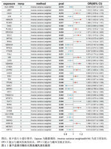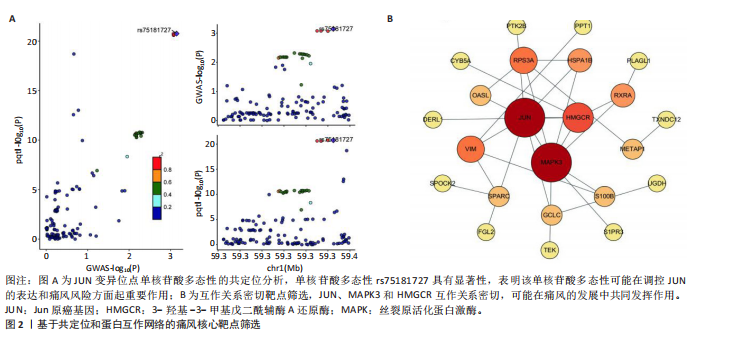 2.1 孟德尔随机化分析 经筛选获得7 417个强关联单核苷酸多态性作为工具变量,所有单核苷酸多态性的F值均> 10。结果显示,在采用逆方差加权方法进行的孟德尔随机化分析中,OR < 1的基因共有22个,包括NPTX2、RXRA、METAP1、RPS3A、DERL1、SEMA3A、FGL2、SPARC、CYB5A、KRT10、TRPC6、JUN、TXNDC12、CD59、OASL、MTRF1L、PTK2B、HLA-DOB、HLA-DRB6、MAPK3、UGDH、TEK等,与痛风存在显著的负相关因果关系;OR > 1的基因共有18个,包括PPT1、S100B、TPCN2、TPK1、PLAGL1、PCSK5、HSPA1B、S1PR3、ULK3、PRG4、VIM、GCLC、CCRL2、SEMA6A、HMGCR、TUFT1、UBR1、SPOCK2等,与痛风存在显著的正相关因果关系(表2,图1)。 2.2 核心靶点筛选 共定位分析显示40个基因中JUN(SNP.PP.H4=0.733)与痛风关系显著,为痛风关键易感基因(图2A);蛋白互作网络显示JUN、MAPK3和HMGCR互作关系最为密切(图2B)。 2.3 京都基因与基因组百科全书和基因本体论通路富集分析 京都基因与基因组百科全书富集结果显示共富集到25条通路,包括Th17、"