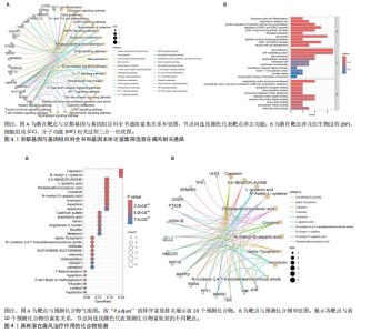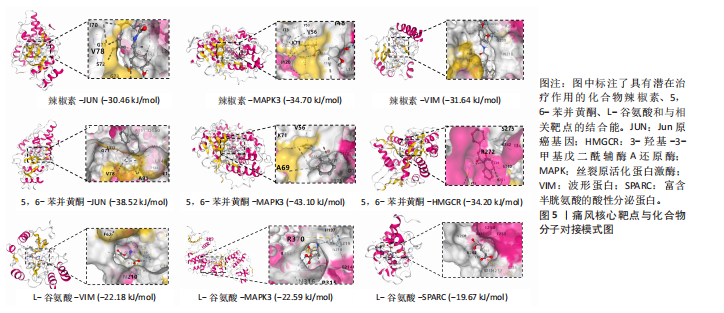 Th1和Th2细胞分化、MAPK、TNF、ErbB、白细胞介素17、缺氧诱导因子1、Toll样受体等信号通路(图3A);基因本体论富集显示生物过程类别中共富集到72条显著通路和过程,如抗原加工和呈递、ERK1/2级联反应的正向调控、MAPK级联反应的正向调控和谷胱甘肽代谢过程等;细胞组成类别中共富集到24条显著通路,如谷胱甘肽突触调节等;分子功能类别中共富集到17条显著通路,如泛素蛋白的调节等(图3B)。 2.4 药物预测富集分析 在DGIbd数据库中获取了2022年2月发布的“类别数据”同时从FINAN等[20]的综述中获取可用于药物治疗的基因列表。共预测出372种具有潜在治疗作用的化合物,包括槲皮素、和厚朴酚、山柰酚、肉桂醛、穿心莲内酯和异黄酮等多种中药单体;按“P.adjust”值排序富集排名前3的化合物为辣椒素、5,6-苯并黄酮和L-谷氨酸,涉及的作用靶点包括辣椒素:JUN、VIM、MAPK3、TEK、SPARC、PPT1、RXRA、KRT10;5,6-苯并黄酮:JUN、HMGCR、MAPK3、GCLC、HSPA1B、KRT10;L-谷氨酸:VIM、SPARC、MAPK3、PTK2B、PPT1、KRT10(图4)。 2.5 预测药物分子对接 结合“2.2”中筛选的核心靶点和“2.4”中化合物富集靶点,运用分子对接技术分析辣椒素与JUN、VIM、MAPK3,5,6-苯并黄酮与JUN、HMGCR、MAPK3,L-谷氨酸与VIM、SPARC、MAPK3的结合程度(图5)。 2.6 中药预测分析 将筛选出的核心靶点进行预测和筛选中药,共选出包括苍术、厚朴、土茯苓、泽泻、丹参、黄连等79味中药(图6A),其中苦味药38种,甘味药31种,辛味药29种,甘味药31种,咸味药10种,酸味药4种,淡味药3种(图6B);寒性药19种,微寒药9种,凉性药2种,热性药1种,温性药27种,微温药6种,平性药15种(图6C);"
