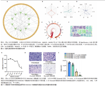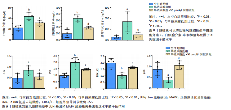归肝经48种,肺经30种,脾经27种,肾经26种,心经21种,胃经19种,大肠经11种,膀胱经6种,胆经6种,心包经3种,小肠经2种(图6D);包含清热药16种,活血化瘀药11种,化痰药7种,补阳药5种,化湿药5种,补气药4种,利水渗湿药4种,平肝息风药4种,祛风湿药4种,补阴药3种,收涩药3种,解表药2种,消食药2种,泻下药2种,止血药2种,杀虫药2种,安神药1种,温里药1种(图6E),涵盖了清热解毒、祛风止痛、活血化瘀、利水渗湿、补益肝肾等多种功效(图6F)。 2.7 细胞实验验证辣椒素对单钠尿酸盐诱导的RAW264.7细胞痛风模型的干预作用 2.7.1 最佳给药浓度筛选 CCK-8结果显示当给药剂量超过75 μmol/L时出现明显细胞毒性(图7A),Transwell细胞侵袭实验结果显示不同浓度辣椒素对单钠尿酸盐诱导的RAW264.7细胞迁移呈梯度抑制,其中50 μmol/L抑制效果最佳(图7B,C),因此确定50 μmol/L为最佳给药浓度。 2.7.2 炎症因子水平 ELISA结果显示单钠尿酸盐诱导的细胞中白细胞介素6、白细胞介素1β和肿瘤坏死因子α的水平显著升高(P < 0.05),提示使用200 μg/mL 单钠尿酸盐晶体刺激细胞12 h造模成功,同时给予50 μmol/L辣椒素干预可以显著降低炎症因子水平(P < 0.05)(图8)。 2.7.3 关键通路基因表达 实时荧光定量反转录PCR结果显示模型组中JUN基因水平和MAPK通路相关基因JNK、ERK1/2、p38水平上调,辣椒素可以降低痛风细胞模型中JUN基因表达,下调MAPK通路相关mRNA的表达(P < 0.05),见图9。"