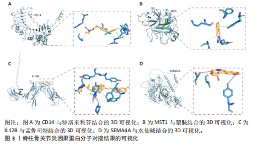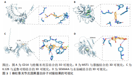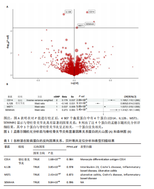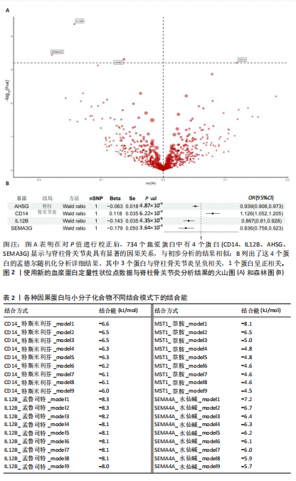 RESULTS AND CONCLUSION: (1) Among 4 907 proteins, 1 878 significant protein quantitative trait locus were screened from 1 553 proteins. After Mendelian randomization analysis, four proteins were identified to have a strong causal relationship with spinal osteoarthritis, namely monocytic CD14, interleukin-12 beta subunit, hepatocyte growth factor-like protein, and Semaphorin-4A. Among them, interleukin-12 beta subunit was negatively correlated with spinal osteoarthritis, while the remaining proteins were positively correlated with spinal osteoarthritis. (2) Additionally, drug prediction results showed that tesmilifene targeting CD14, montelukast targeting interleukin-12 beta subunit, naphthalenamine targeting hepatocyte growth factor-like protein, and lycorine targeting semaphorin-4A all demonstrated good binding affinity in molecular docking, with minimum binding energies below -6.0 kJ/mol. (3) Comprehensive analysis suggest that these four plasma proteins may serve as potential biomarkers or drug development targets for clinical screening, prevention, and intervention of spinal osteoarthritis, and also provide theoretical basis and reference value for related studies in the Chinese population.