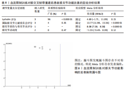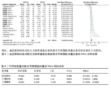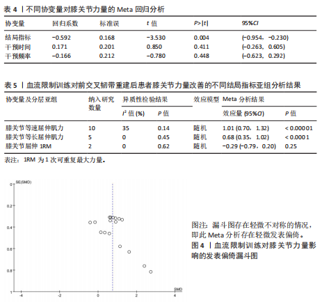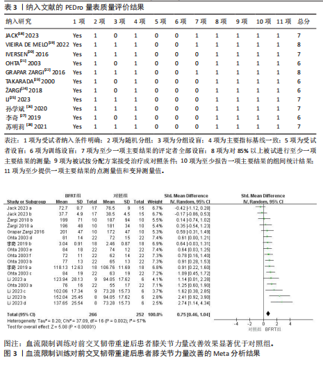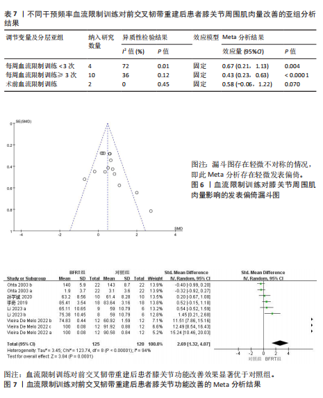 RESULTS: (1) A total of 11 studies involving 317 patients were included. (2) Meta-analysis results showed that blood flow restriction training was superior to traditional resistance rehabilitation training group in improving knee muscle strength [standardized mean difference (SMD)=0.75, 95% confidence interval (CI) (0.46, 1.04), P < 0.000 01], muscle mass around knee joint [SMD=0.48, 95% CI (0.30, 0.66), P < 0.000 01] and knee joint function [SMD=2.69, 95%CI (1.32, 4.07), P=0.000 1]. (3) Subgroup analysis showed that the muscle mass around the knee joint [SMD=0.43, 95% CI (0.23, 0.63), P < 0.000 1] was better than that of the traditional resistance rehabilitation training group when the training times were ≥ 3 times per week.