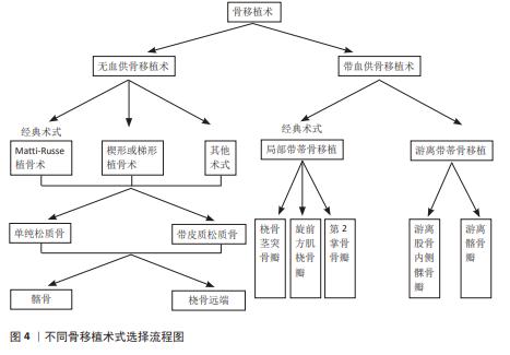 2.1 无血供的骨移植术治疗舟骨骨折不愈合 尽管骨移植术用于治疗腕舟骨骨折已有很长的历史,但腰部和近端舟状骨骨折不愈合仍然是手外科医生面临的挑战[13]。无血供的骨移植是一种可靠的治疗手舟骨骨折不愈合的方法,同样是目前比较主流的手术方式[14],经典的植骨方式常包括Matti-Russe植骨术、楔形或梯形植骨术及其他多种植骨术[9],上述手术方式的植骨供体常来源于髂骨和桡骨远端[15],植骨类型常括单纯松质骨和带皮质的松质骨两种。无血供骨移植术的选择见图4。 2.1.1 经典的骨移植方式 (1)Matti-Russe植骨术:此方法首先由德国波恩医生HERMANN MATTI在1937年提出,并率先应用于临床,他采用背侧入路刮除折端所有死骨、软骨和纤维组织,并刮出一个骨槽,插入松质骨;1956年奥地利维也纳医生Russe对Matti的术式作出了改良:他采用掌侧入路,在骨折处刮出卵圆形的骨腔植入矩形骨栓,并在周围填充松质骨条,故后来称为Matti-Russe 植骨术,并从此被广泛应用于临床。但现在看来Matti-Russe植骨术仅适用于简单、对线好的骨折,不愈合且近侧骨折块完全缺血者不适合使用该法。 (2)楔形或梯形植骨术:1970年,FISK[16]经桡侧入路切除桡骨茎突暴露舟骨,并用切下的茎突修整为楔形或梯形填充舟骨缺损。1984年FERNANDEZ对上述方法作出改良,利用影像学资料提前评估好缺损的形状和大小同时取相应的髂骨进行移植,结合内固定很大程度上提高了骨折的愈合率。 (3)其他术式:1934年MURRAY率先描述纵行骨栓植骨[17];1979年ERBS等报道了使用双凹形植骨[17];1988年殷铭东等[18]应用同种异体骨植骨、1998年SANDOW[19]采用肋骨软骨进行舟骨置换等,上述方法均获得了满意的临床疗效。 2.1.2 不同类型的骨移植物 (1)单纯的松质骨移植:对于不需要纠正畸形且无骨坏、移位较小的舟骨骨折不愈合,单纯松质骨移植加坚强内固定可以达到很好的治疗效果,已成为大多数外科医生的治疗选择。YASUDA等[20]研究显示在28例舟骨骨折不愈合患者中,采用掌侧入路从桡骨远端打磨成双凹松质骨进行移植,克氏针内固定,获得了100%的愈合率,且未见并发症的发生。BAE等[21]采用桡骨远端松质骨移植物和无头螺钉固定治疗31例不稳定腰部舟状骨骨不连患者,愈合率达到93.3%,并获得了良好的腕关节功能。 (2)带皮质松质骨移植:对于骨坏死、骨缺损、驼背畸形的舟骨骨折不愈合,临床上常使用带皮质松质骨移植物来纠正舟状骨缩短和掌侧成角[4]。SCH?FER等[22]在对16例复杂顽固性手舟骨骨折不愈合患者进行治疗时,使用自体带皮质松质骨进行移植辅助加压螺钉内固定,通过长达平均54个月的随访,术后通过腕关节功能和影像学评定,得出皮质松质骨移植辅助加压螺钉内固定是一种很好的方法。HEGAZY等[23]选择122例不稳定腰部舟骨骨折不愈合患者随机分成2组,分别接受自体皮质松质髂骨植骨结合多根克氏针或赫伯特螺钉内固定,结果显示两组的愈合率分别为91%和 88%。MARKOWICZ等[24]对48例术后舟骨骨折不愈合患者进行自体带皮质松质骨移植手术,愈合率达88%,进一步证明皮质松质骨移植是一种有效的外科术式,不仅有助于骨折愈合而且有助于恢复舟骨的形态和长度,还可以很好地预防创伤后腕关节炎。 虽然单纯松质骨和带皮质松质骨在最终促进骨折愈合方面无明显差异,但二者各有优缺点。HEGAZY等[25]于2006年将98例舟状骨骨折不愈合的患者随机分成2组,其中一组患者接受自体单纯松质骨移植,另一组采用带皮质松质骨移植,二者均采用掌侧入路,使用3 mm赫伯特螺钉进行固定,结果显示在骨折愈合方面二者没有明显差异;但是单纯松质骨移植物具有更强的成骨能力,愈合时间明显较皮质松质骨缩短;带皮质松质骨具有更高的骨密度,具有很好的支撑作用,可以更好地恢复舟状骨高度、腕关节面平整度,显著改善腕关节功能,在纠正骨折畸形方面更有优势。SAYEGH等[26]在2014年的回顾性分析中纳入604例患者,对术后骨折愈合率和腕关节功能评分进行综合评价分析后得出同样的结论。KIM等[27]连续治疗了38例腰部不稳定舟骨骨折不愈合的患者,采用带皮质松质骨和单纯松质骨移植结合不同内固定方式得出同样的结论。 (3)不同供体部位对手舟骨骨折不愈合的影响:骨移植的首选供体部位仍有待明确,但研究表明无论供体部位是髂骨还是桡骨远端对舟骨的愈合率和腕关节功能恢复方面并无明显差异[28]。TAMBE等[29]回顾性研究了68例采用带皮质松质骨移植治疗有症状的舟骨骨折不愈合患者,其中44例来自用髂骨,24例来自桡骨远端,结果显示二者在愈合率、腕关节平整度和腕关节功能恢复方面无明显差异。DUNCUMB等[30]在一项关于自体骨移植治疗舟骨不愈合的系统回顾和荟萃分析中证实,移植物来源对愈合率无明显影响。SHIN等[31]在2024年对38例舟骨折不愈合患者(其中桡骨远端组15例,髂骨组23例)进行皮质松质骨移植内固定治疗,结果进一步证实上述结论,但在供区并发症方面,桡骨远端明显低于髂骨[32]。 2.2 带血供的骨移植术治疗骨折不愈合 带血供骨移植术的选择见图4。 2.2.1 局部带血管蒂骨瓣移植 随着对腕部血管解剖认识的提高和显微外科技术的进步,带血管蒂骨移植物越来越多地被应用于舟状骨骨折不愈合。相比于传统的非血管化骨移植物,带血管的骨移植物为直接愈合而非爬行替代过程,舟骨骨折不愈合的血运重建更快、丢失的骨量更少、骨质融合更