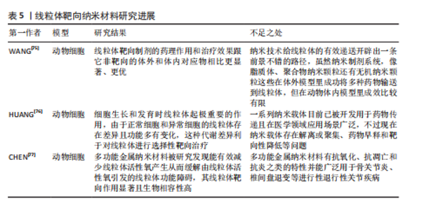 2.3.2 线粒体动力学的临床药物研究 线粒体动力学的临床药物创新研发领域有着很大的研究前景,可以着重于开发一系列能够精准干预Drp1与Fis1之间相互作用的新型药物,如线粒体分裂抑制剂1通过抑制Drp1的活性来发挥作用[72];TAT-Drp1-SpS这类人工设计的多肽能够有效阻断由糖原合成酶激酶3β诱导的Drp1磷酸化过程[73],为调节线粒体功能提供了新的思路。 靶向线粒体抗氧化剂结合药物的研究也有较大的应用价值,例如线粒体靶向抗氧化剂Elamipretide TFA(MTP-131)是一个心磷脂过氧化物酶抑制剂和线粒体靶向的肽[74],这种抗氧化剂展现出降低Drp1蛋白水平的能力,能够上调MFN2和OPA1的蛋白水平,有效改善线粒体功能。这些创新药物与治疗策略的开发能精准调节线粒体的动态平衡,在骨缺损愈合等生物医学问题上开创新型的治疗思路。有关线粒体动力学的临床药物研究见表4。 2.3.3 线粒体靶向纳米颗粒 线粒体导向型纳米载体是一种特殊的纳米级输送系统,有着高精确度的靶向系统,能较为精确地将药物或其他治疗性分子输送至细胞内部的线粒体中[75],线粒体靶向纳米颗粒递送体系能巧妙的通过调控能量代谢过程与维持细胞内的氧化还原平衡状态,影响细胞增殖与分化并诱导线粒体自噬等机制,一定程度上影响细胞凋亡过程。 线粒体靶向策略相较于传统的纳米材料等递送方法有更高的治疗潜力与效率[76]。有研究团队开发了一种针对线粒体的多酚与氨基酸自组装形成的纳米颗粒(EC Nanoparticles),工程化碳纳米颗粒具备清除活性氧的能力,可以维持线粒体的稳态,促进骨缺损修复[77]。未来应多加开展线粒体调节功能的靶向纳米颗粒的创新研究,增强线粒体功能和调控线粒体自噬等过程,从而明显提升骨组织再生的能力,加快骨缺损的修复过程。这些创新方法为骨生长与损伤修复领域带来了新颖的治疗策略,也为开创新型治疗药物的开发提供了新的研究方向。有关线粒体靶向纳米材料见表5。"
