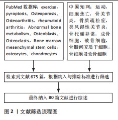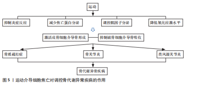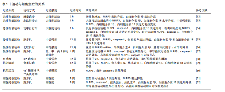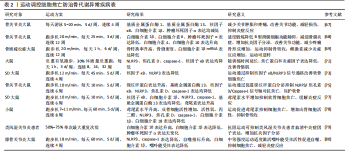 中核因子κB受体活化剂是细胞焦亡信号通路的关键启动因子,是诱导破骨细胞分化与成熟的重要调节因子。相关研究指出,绝经后骨质疏松症患者体内肿瘤坏死因子α水平显著升高,该因子不仅参与细胞焦亡导致炎症反应,还可通过激活核因子κ信号通路增强核因子κB活化剂诱导的破骨细胞形成,最终导致骨密度加速流失;运动干预可有效抑制肿瘤坏死因子α的表达,进而阻断细胞焦亡信号的激活,抑制破骨细胞生成与活性,从而在分子层面上发挥骨保护作用[70]。因此,运动通过多重机制干预炎症反应,既可抑制破骨细胞的分化与活性,又可激活成骨相关信号通路,是改善骨代谢异常、预防和干预骨代谢异常疾病的重要策略。 (2)运动介导细胞焦亡抑制焦亡蛋白分泌:运动干预可以通过调控NLRP3/caspase-1/焦孔素D的联级通路抑制细胞焦亡的发生,从而改善骨代谢紊乱状态。过度的细胞焦亡不仅引发组织细胞广泛死亡,其裂解过程中释放的炎症因子等递质可加剧局部炎症反应,进一步激活并放大细胞焦亡的联级效应,抑制NLRP3的表达可作为防止细胞焦亡的靶向干预手段[71]。研究发现,负重有氧跑步可显著改善骨质疏松模型大鼠的身体组成,降低NLRP3、焦孔素D和caspase-1蛋白表达水平,从而抑制细胞焦亡下游通路中炎症因子的释放[72]。运动可从转录和翻译2个层面协同调控焦亡信号,有效缓解组织炎症与细胞损伤,改善细胞焦亡的严重程度。YANG等[73]的研究显示,4周中等强度跑步机运动可抑制核因子κB p65的核转位及NLRP3炎症小体的组装,显著降低下游焦亡蛋白caspase-1的表达,从而减轻软骨细胞的焦亡程度,延缓软骨退变过程,表明有氧运动可通过调节核因子κB/NLRP3信号通路发挥抑制焦亡、保护软骨作用,有助于改善骨关节炎的病理过程。有研究报道,持续6周的高强度间歇运动干预可显著抑制脂多糖诱导的NLRP3炎症小体激活,抑制细胞焦亡相关蛋白的表达,降低炎性细胞因子的释放,从而有效减轻骨组织的炎症损伤[74],进一步拓展了运动干预在调控焦亡通路、干预骨代谢异常疾病中的潜在价值。因此,运动通过调控NLRP3/caspase-1/焦孔素D介导的细胞焦亡信号通路,在降低炎症水平、保护骨组织结构、改善骨代谢异常等方面具有显著作用,具有成为骨代谢相关疾病干预手段的潜力。未来可进一步深入探究不同运动方式、强度及周期对焦亡通路的调控效果,以优化运动处方的个体化干预策略。 (3)运动介导细胞焦亡调节肌因子分泌:运动通过调节肌因子的分泌抑制焦亡蛋白和炎症因子的活化,进而防治骨代谢异常疾病。“肌因子”是机体在运动过程中由肌肉、脂肪等组织器官分泌的生物活性分子,在调节机体代谢和炎症反应方面具有重要作用。目前,在运动介导细胞焦亡防治骨代谢异常疾病的研究中,主要涉及镍纹蛋白样蛋白和鸢尾素。镍纹蛋白样蛋白具有抗炎作用,在骨代谢性疾病中可缓解病程进展。LIU等[75]研究发现,低、中、高3种运动强度均可提高SD大鼠血清和滑液中镍纹蛋白样蛋白含量,其中中等强度运动组镍纹蛋白样蛋白增加幅度最大,同时伴有基质金属蛋白酶13和核因子κB mRNA 表达抑制以及Ⅱ型胶原蛋白表达的恢复。提示运动通过提升镍纹蛋白样蛋白水平发挥抗炎作用,进而抑制NLRP3/caspase-1/焦孔素D联级反应,减轻软骨细胞焦亡。 鸢尾素能够促进成骨细胞的增殖、分化和矿化,调节破骨细胞的分化与成熟[76]。JIA等[77]研究发现,中等强度运动可诱导鸢尾素分泌达到最高水平,对缓解骨代谢异常具有较好的治疗效果;鸢尾素通过抑制核因子κB 信号通路降低 NLRP3 和 caspase-1 的表达,恢复软骨细胞中Ⅱ型胶原蛋白的表达,激活成骨细胞活性。另有研究表明,8 周体育锻炼可改善骨小梁的微观结构、提高鸢尾素表达、促进Ⅱ型肌纤维比例的增加、减弱中枢焦亡反应,从而抑制破骨细胞活性,促进骨形成[78],提示鸢尾素在小鼠中可促进骨形成、增加骨密度,具有较强的合成代谢作用。因此,中等强度的运动有利于镍纹蛋白样蛋白和鸢尾素的分泌,增强成骨细胞活性,提高骨密度,改善骨代谢异常所致的骨质流失。此外,运动过程中肌肉分泌的白细胞介素6也具有抗炎作用。有研究表明,类风湿关节炎患者在运动前1 h白细胞介素6水平迅速升高,随后逐渐下降,并在运动后 24 h恢复至基线水平[79],说明运动可促进抗炎因子的分泌,但肌肉来源的白细胞介素6在运动过程中的具体炎症调节作用仍需进一步研究。目前,关于运动调控肌因子以改善细胞焦亡进而防治类风湿关节炎的直接研究相对较少,尚需更深入的机制探索予以证实。 (4)运动介导细胞焦亡减缓氧化应激水平:运动干预还可通过减轻氧化应激水平抑制细胞焦亡,改善骨代谢异常疾病。嘌呤能受体作为钠钾离子通道,在炎症反应中发挥着“分子开关”的关键调控作用,可导致细胞内钾离子外流,而钾离子外排被认为是激活NLRP3炎性小体的重要信号,进而诱导细胞焦亡联级反应。LI等[80]研究表明,中等强度跑台运动组小鼠中NLRP3、caspase-1及白细胞介素1β的表达显著下降。值得注意的是,嘌呤能受体的表达在不同强度运动之间表现出非线性变化趋势:在中等强度运动组中表达水平最低,而自噬相关指标则明显升高,同时伴随骨赘形成减少和关节间隙变窄程度减轻。研究提示适度激活嘌呤能受体可能通过诱导细胞自噬发挥保护作用,而过度激活则可能促进软
