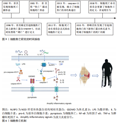 关节疾病中对骨稳态具有重要调控作用[24]。肿瘤坏死因子α通过激活骨细胞内的核因子κB通路直接增强核因子κB受体活化因子配体(RANKL)表达,促进破骨细胞生成。MARAHLEH等[25]研究发现,经肿瘤坏死因子α处理的骨细胞核因子κB受体活化因子配体(RANKL) mRNA表达显著增加,添加抑制剂后该表达水平明显降低。一方面,核因子κB上调T细胞核因子的表达,促进破骨细胞基因转录和分化;另一方面,核因子κB进入细胞核后促进NLRP3炎性小体转录,诱导巨噬细胞与成骨细胞发生焦亡并释放炎症因子。在牙周炎等感染性炎症引起的骨吸收过程中,NLRP3可促进破骨细胞分化,敲除NLRP3基因可阻断白细胞介素1β的释放并抑制破骨细胞分化,而NLRP3炎性小体特异性抑制剂MCC950可有效抑制破骨前体细胞的分化,显著减缓牙槽骨丢失,降低白细胞介素1β活化水平及破骨细胞分化[26]。另外,NLRP3不仅增强破骨细胞的骨吸收功能,还可促进破骨细胞生成、抑制因子聚合酶1的降解,因此,NLRP3炎性小体的激活不仅引发炎症递质的释放,还可诱导细胞因子的自主调控反应[27]。由此可见,成骨细胞焦亡减弱骨组织形成,同时产生的炎症因子刺激破骨细胞活性,加重病理进程,但多数研究以体外细胞实验为主,缺乏系统性体内实验或长期动物模型研究。此外,焦亡抑制剂的作用机制多为初步观察,具体剂量、安全性、长期效应仍需系统验证。 2.2.2 细胞焦亡与骨关节炎 骨关节炎是关节组织修复与破坏不平衡所引起的关节退行性疾病[28],受年龄、肥胖和机械因素影响,病理表现为软骨基质降解、滑膜炎症等,易导致关节功能障碍、疼痛、僵硬以及丧失活动能力[29]。通常软骨处于稳定状态,当促炎因子、机械过载或代谢紊乱时引起软骨细胞外基质降解,由于软骨中血管不足其再生和修复就会受到限制,导致细胞功能障碍炎症反应引发骨关节炎;另一方面,滑膜炎症是骨关节炎常见的病理表现,严重的滑膜炎会加剧软骨侵蚀[30-31]。软骨细胞焦亡加重骨关节炎进展,同时细胞焦亡引起的炎症反应导致更严重的滑膜炎症和疼痛,因此,细胞焦亡已成为骨关节炎防治的研究热点。 软骨细胞焦亡是导致骨关节炎发生的重要因素。基质金属蛋白酶13具有裂解Ⅱ型胶原蛋白的特异能力,是介导软骨细胞外基质降解的关键因子[32]。PAN等[33]研究发现,白细胞介素1β刺激可显著增加软骨细胞和巨噬细胞中基质金属蛋白酶13、白细胞介素6、白细胞介素1β、NLRP3 和 caspase-1表达,同时下调蛋白聚糖和Ⅱ型胶原蛋白表达,提示细胞焦亡加速基质降解并促进炎症因子的释放。有研究表明,厚实酸可抑制白细胞介素1β诱导的软骨细胞炎症反应,包括一氧化氮、前列腺激素、肿瘤坏死因子α和白细胞介素6的产生,同时逆转白细胞介素1β诱导的基质金属蛋白酶13上调和Ⅱ型胶原及聚集蛋白聚糖下调,该作用机制可能与抑制核因子κB信号通路、减缓炎症反应及细胞外基质变性有关[34]。此外,抑制软骨细胞焦亡可有效延缓骨关节炎的进程。研究表明,石斛碱[35]、转录因子Sox9[36]、姜黄素及隐丹参酮等活性物质可通过抑制核因子κB通路和下调白细胞介素1β等炎症因子的表达[37-38],抑制软骨细胞焦亡,具有作为骨关节炎潜在治疗药物的研究价值。 滑膜炎症是骨关节炎发生和进展的重要致病因素之一。在多种炎性细胞因子中,白细胞介素1β是具有代表性的炎症递质,能够显著促进骨组织与软骨的破坏进程;而白细胞介素18通过延长白细胞介素1β的作用时间进一步加剧炎症反应。有研究表明,在大鼠滑膜细胞焦亡模型中,滑膜组织中NLRP3、白细胞介素1β和白细胞介素18的表达水平均显著升高,通过靶向抑制白细胞介素1β和白细胞介素18的表达可有效降低NLRP3、caspase-1及焦孔素D的含量,从而缓解膝骨关节炎相关的滑膜炎症[39]。此外,高迁移率族蛋白B1是由巨噬细胞分泌的重要炎症因子,在滑膜炎症中发挥关键作用。研究发现,骨关节炎大鼠滑膜细胞中高迁移率族蛋白B1、NLRP3和caspase-1表达水平均呈现上调趋势,提示滑膜细胞焦亡可诱导高迁移率族蛋白B1的过度产生,进而加剧炎症反应,为改善滑膜炎症提供了新的干预靶点[40]。上述研究初步揭示软骨细胞和滑膜细胞焦亡在骨关节炎中的作用,但软骨细胞和滑膜细胞之间是否存在炎症信号的交互作用还需进一步探讨。此外,当前以大鼠模型为主,未来可探索多种实验模型,推进临床试验。 2.2.3 细胞焦亡与类风湿关节炎 类风湿关节炎是一种以持续性滑膜炎、软骨破坏和骨侵蚀为特征的自身免疫性疾病,主要临床表现为关节疼痛、肿胀和僵硬。类风湿关节炎的病理过程主要由促炎与抗炎因子失衡所驱动,慢性滑膜炎和关节破坏是该病的核心特征[41]。研究表明,在类风湿关节炎进展过程中,细胞焦亡可引发大量炎症因子的释放,进一步加剧慢性滑膜炎症及骨与关节组织损伤,同时刺激免疫系统产生一定的抗炎反应[42]。滑膜巨噬细胞在类风湿关节炎中的作用尤为关键,主要包括M1型和M2型两类:M1型分泌促炎因子,激活机体免疫反应;M2型释放抗炎因子,有助于抑制炎症反应。M1型巨噬细胞在一定条件下可极化转化为M2型巨噬细胞。ZHAI等[43]的研究发现,类风湿关节炎患者巨噬细胞中M1型滑膜巨噬细胞、caspase-3和焦孔素D的表达显著升高,并且焦孔素D表达水平与细胞焦亡程度呈正相关,提示抑制炎性细胞因子的表达已成为类风湿关节炎